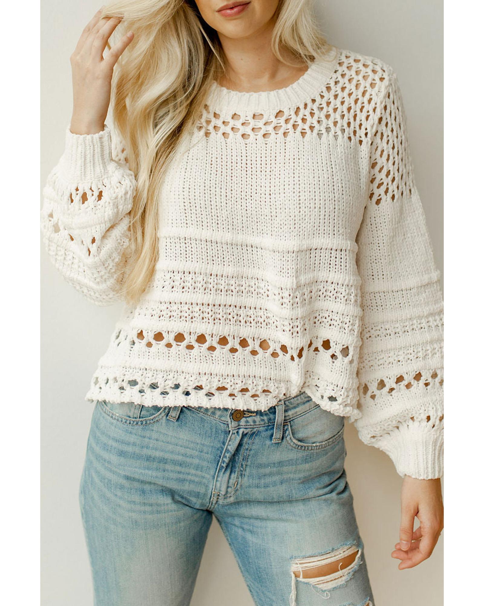 White Solid Color Pointelle Knit Puff Sleeve Sweater – L
