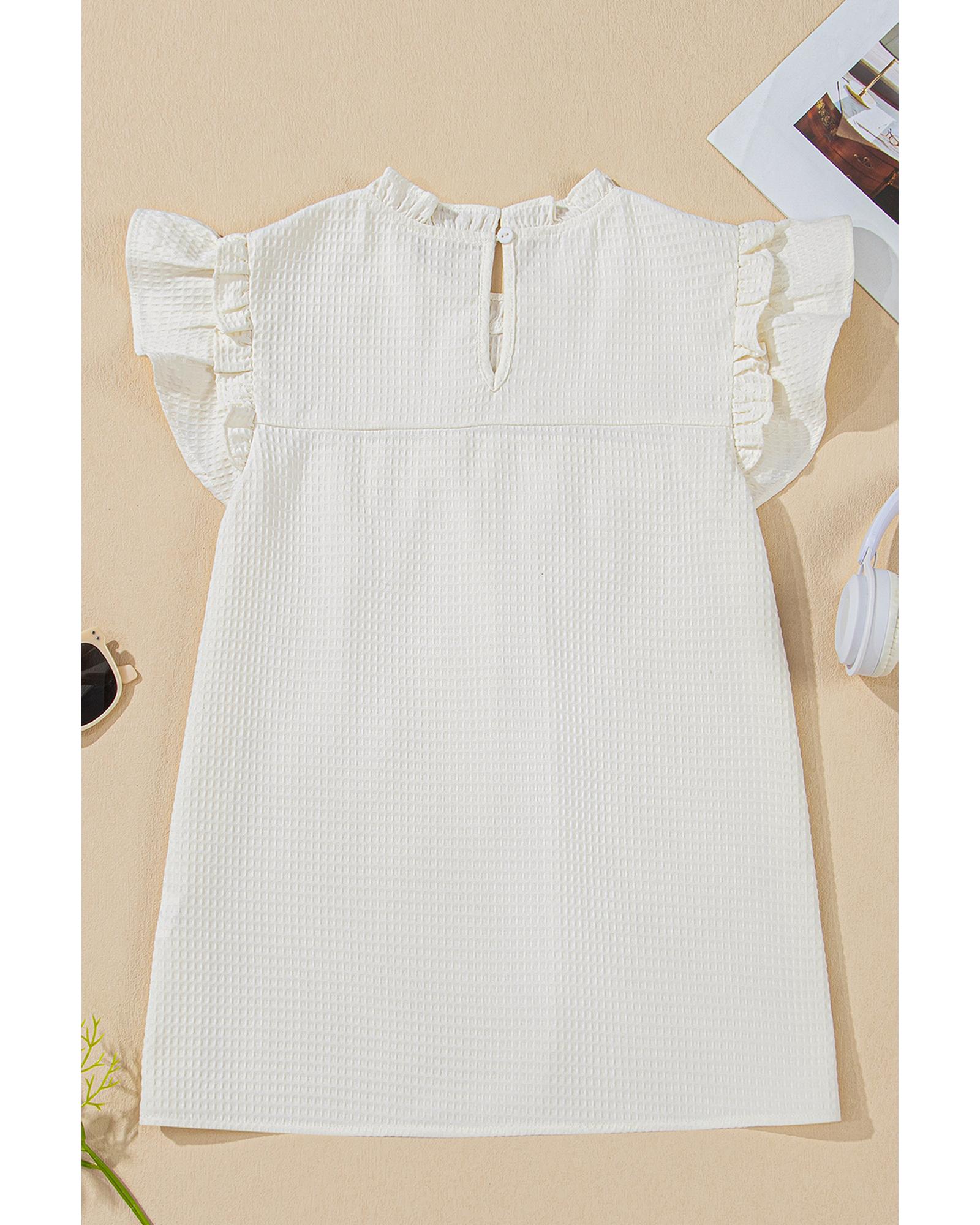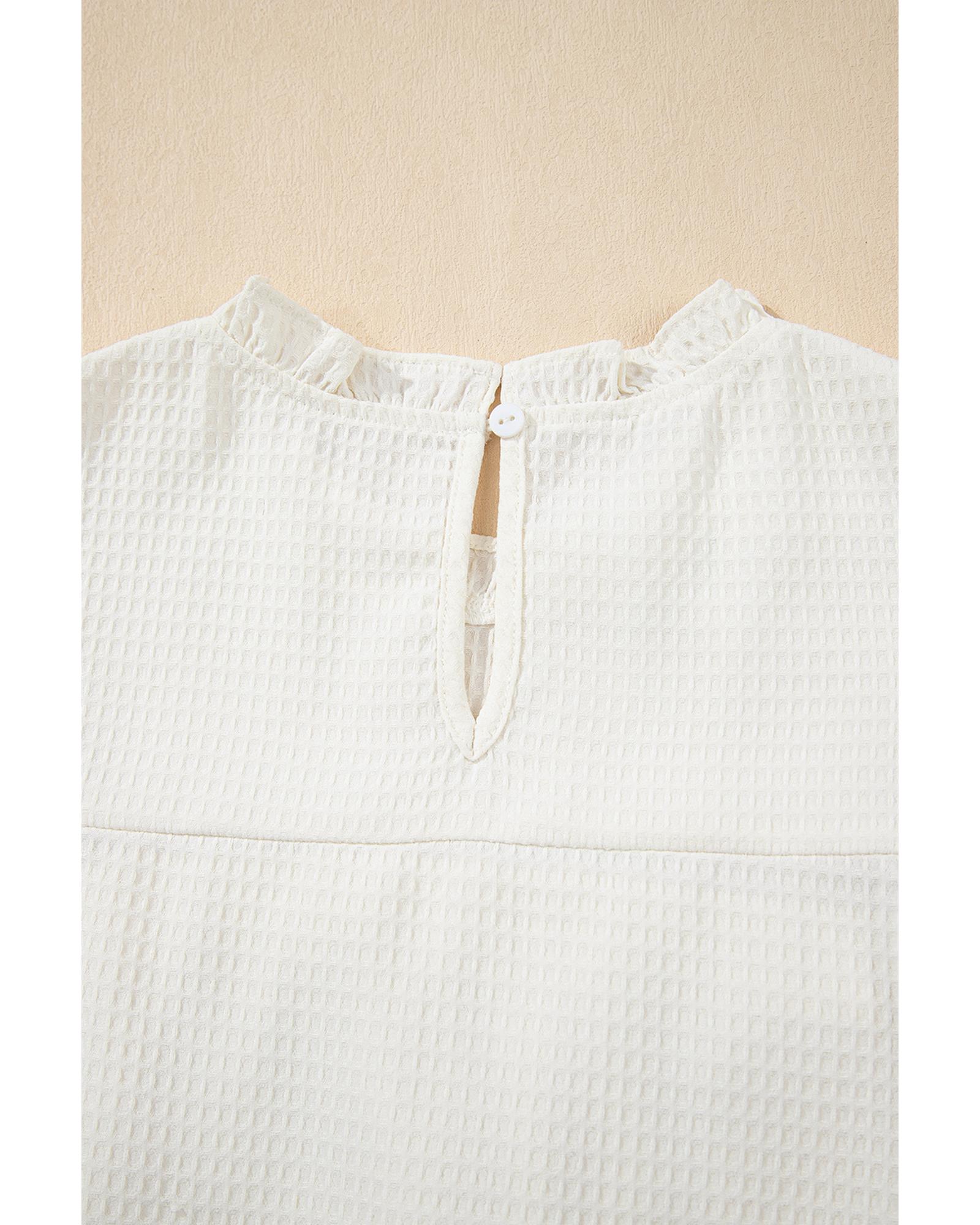 White Solid Color Ruffle Trim Waffle Knit Blouse – L