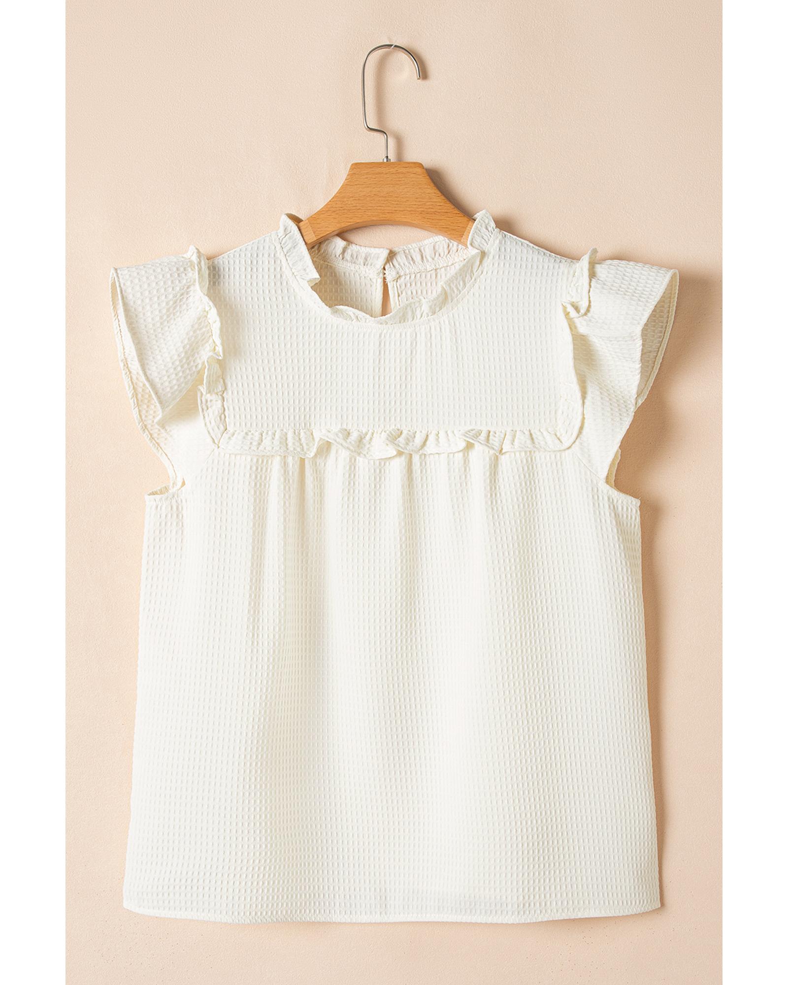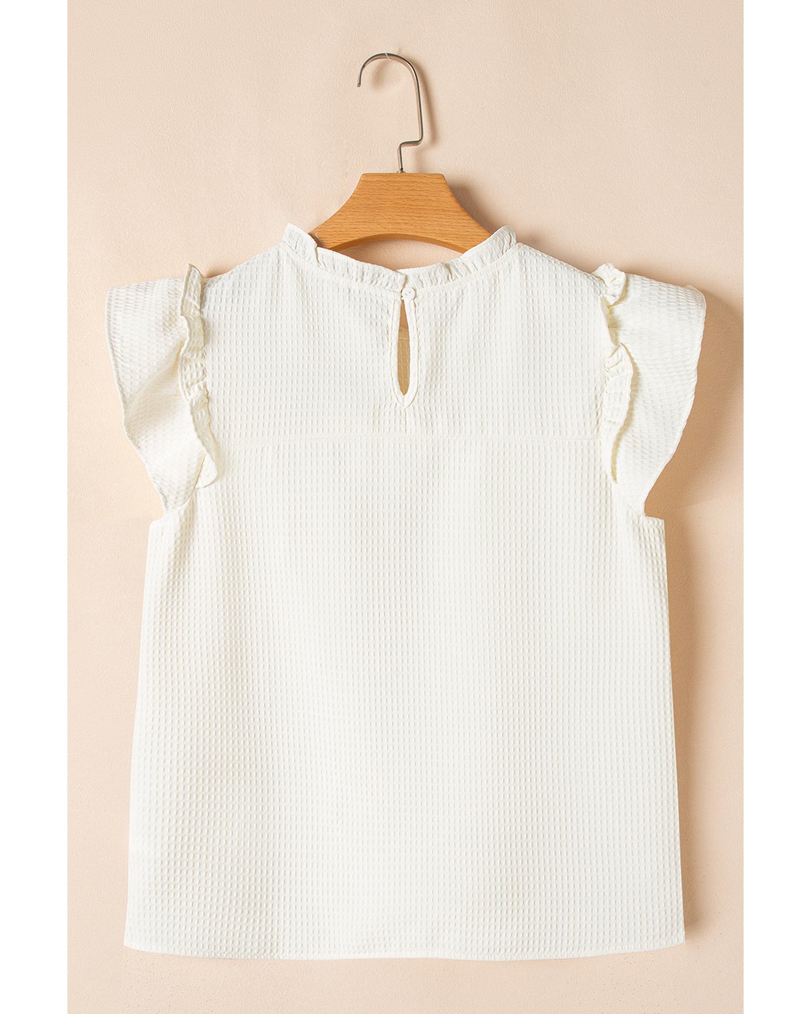 White Solid Color Ruffle Trim Waffle Knit Blouse – M