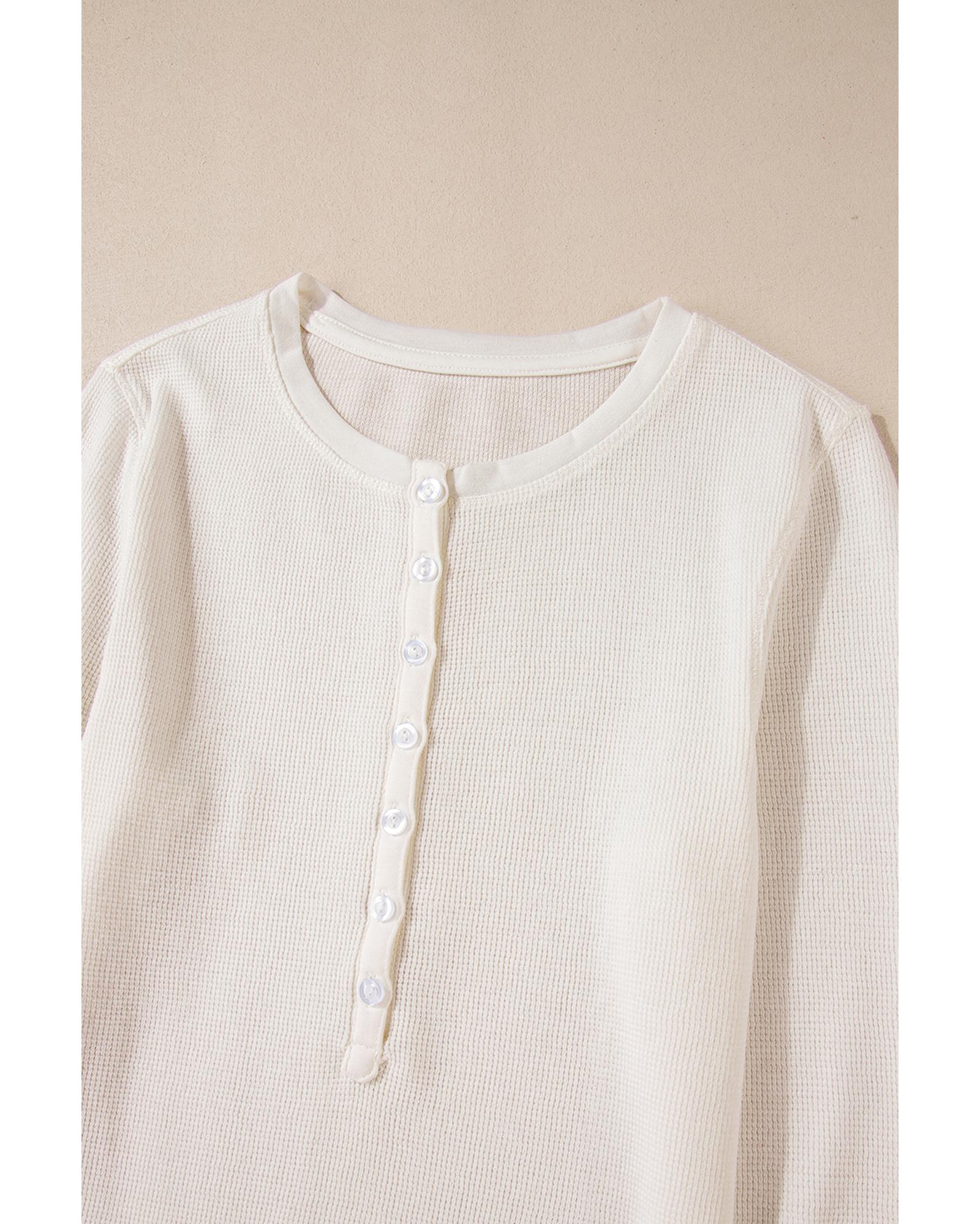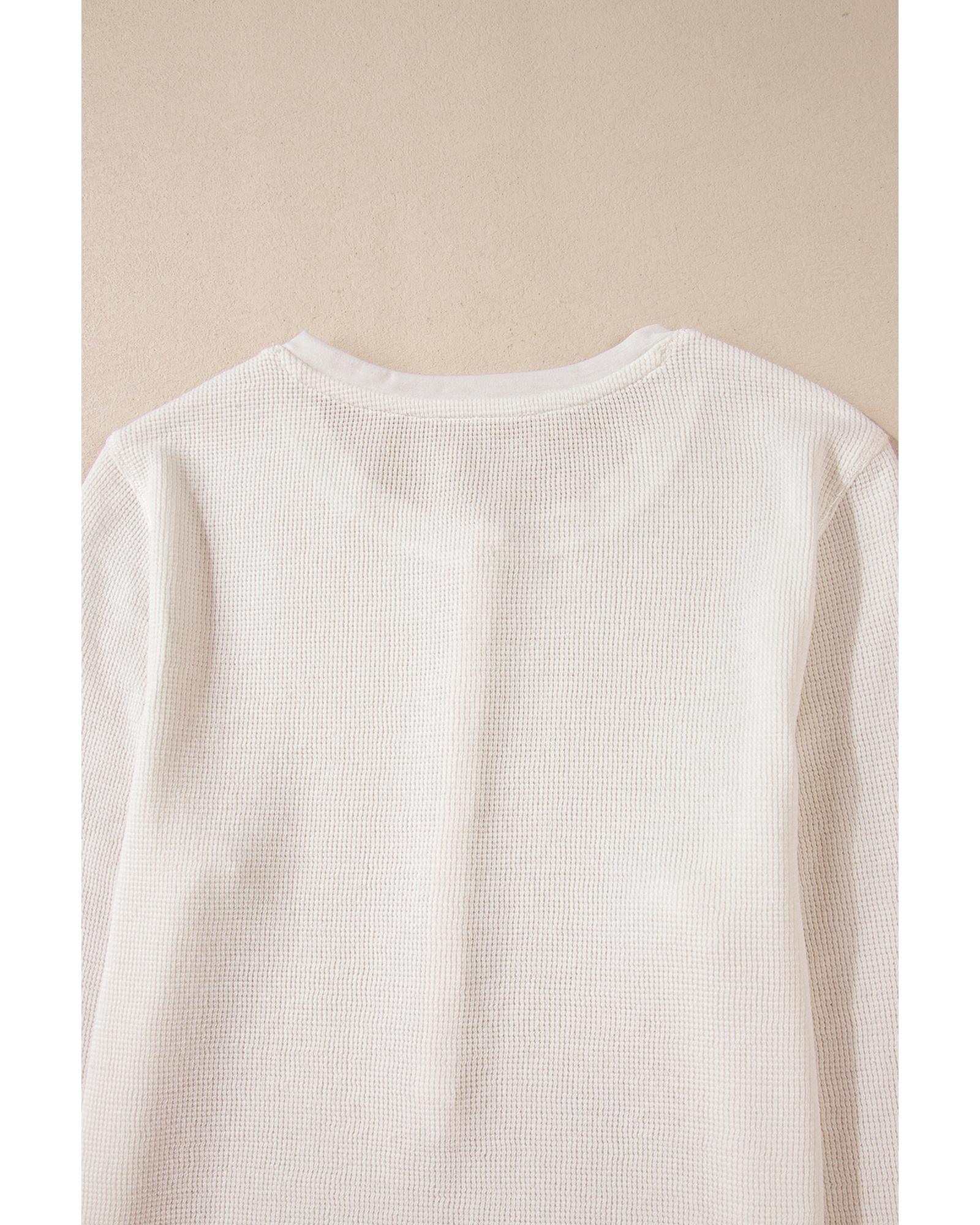 White Solid Color Waffle Half Button Long Sleeve Top – M