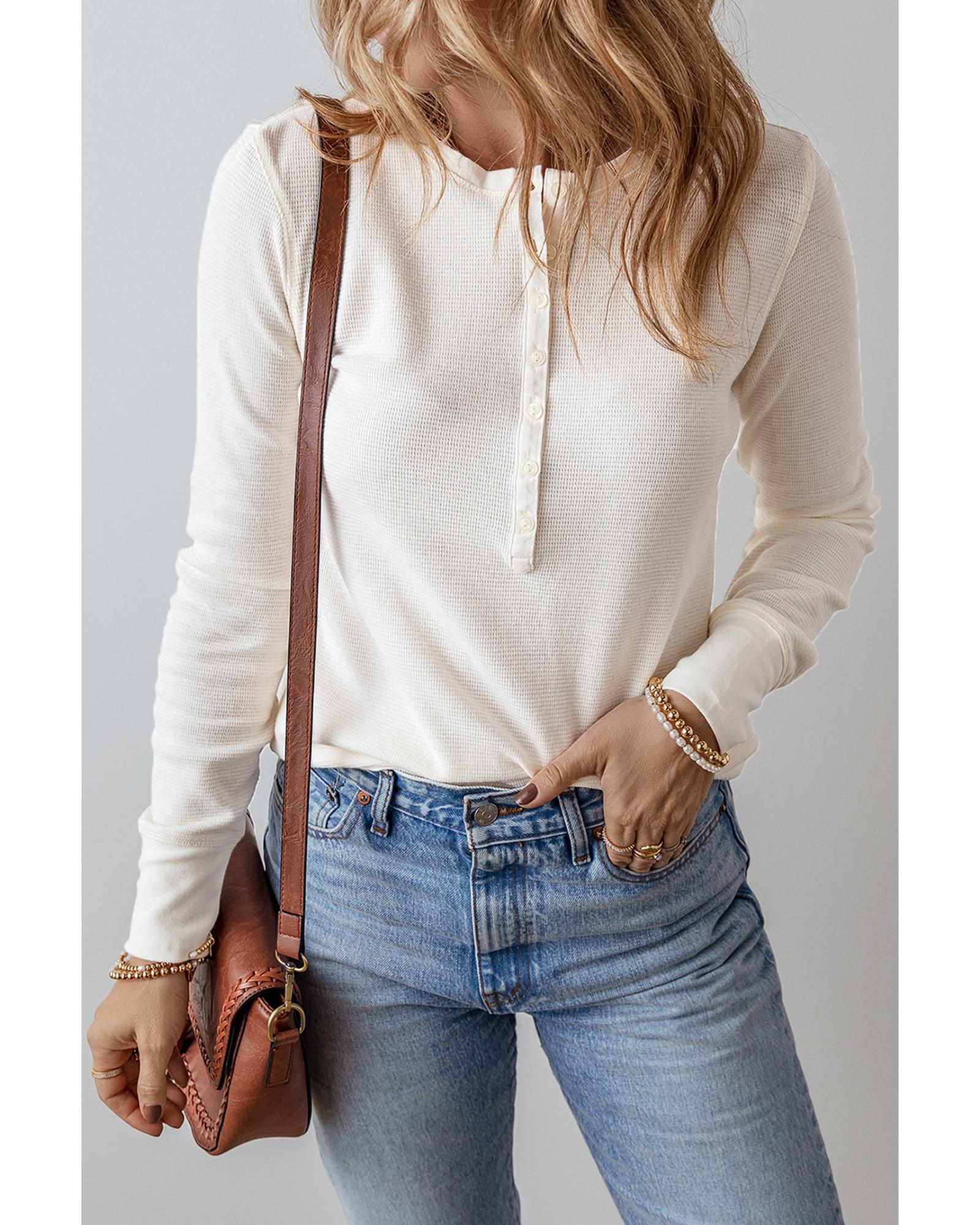 White Solid Color Waffle Half Button Long Sleeve Top – S