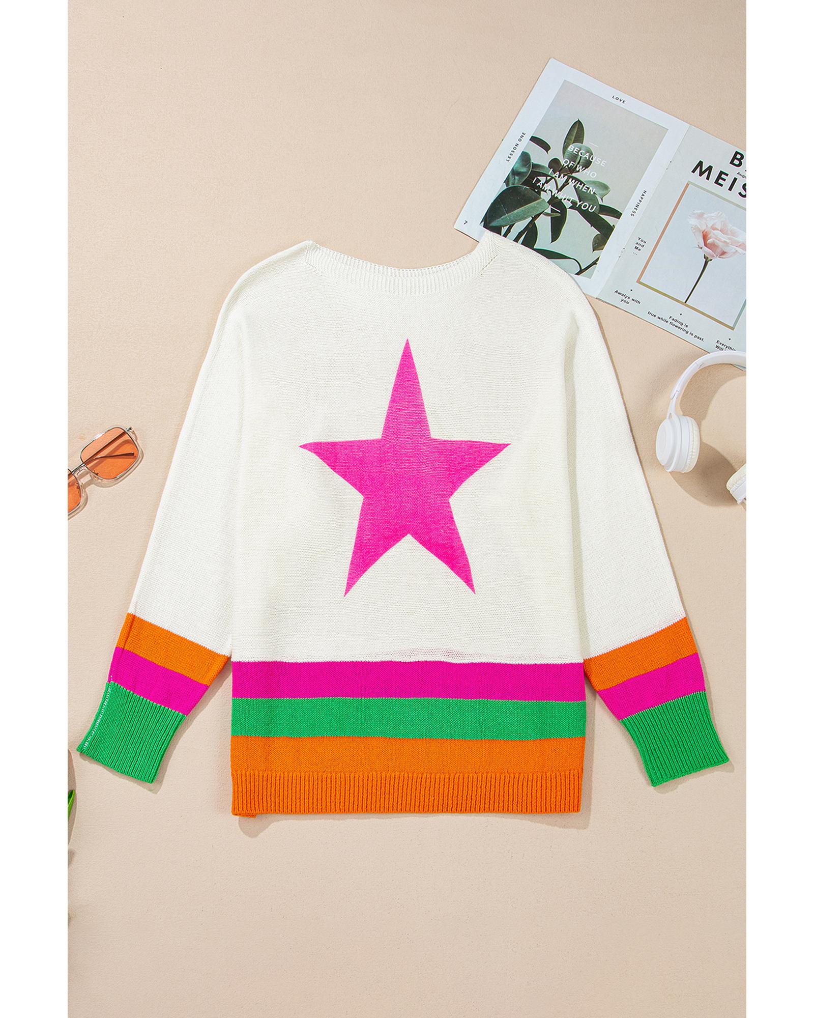 White Star Pattern Colorblock Striped Edge Drop Shoulder Sweater – M