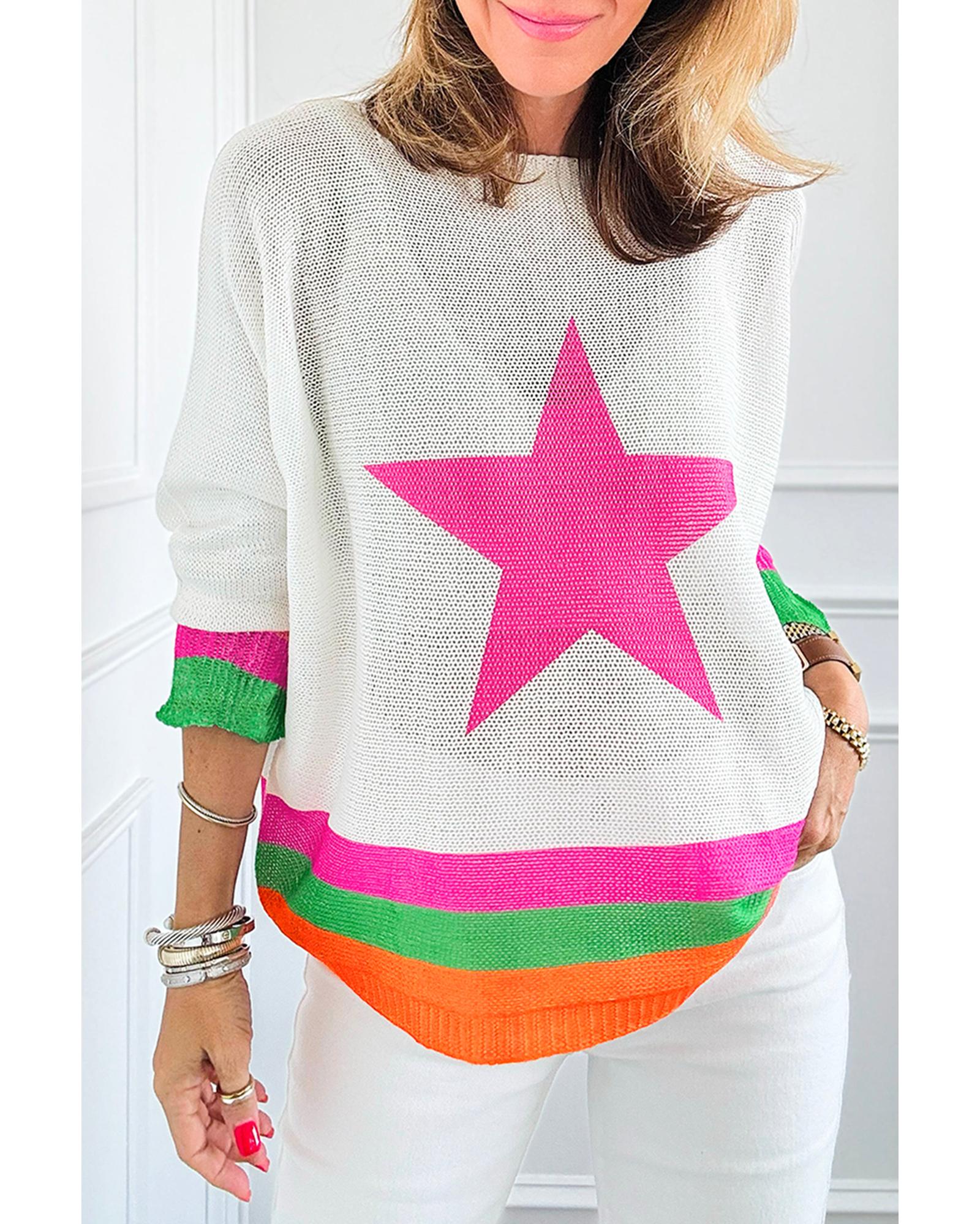 White Star Pattern Colorblock Striped Edge Drop Shoulder Sweater – XL