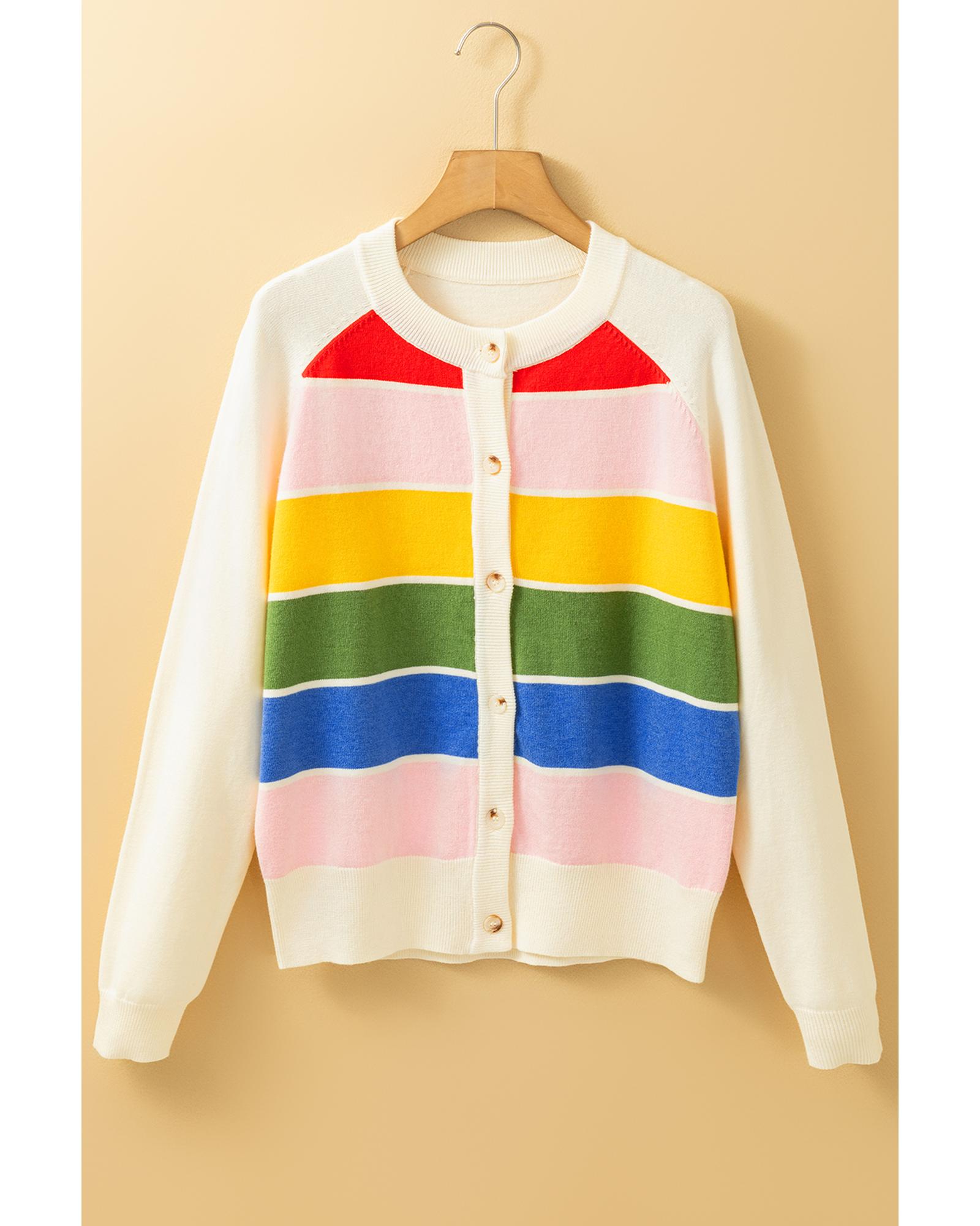 White Stripe Colorful Pattern Button Front Sweater Cardigan – L