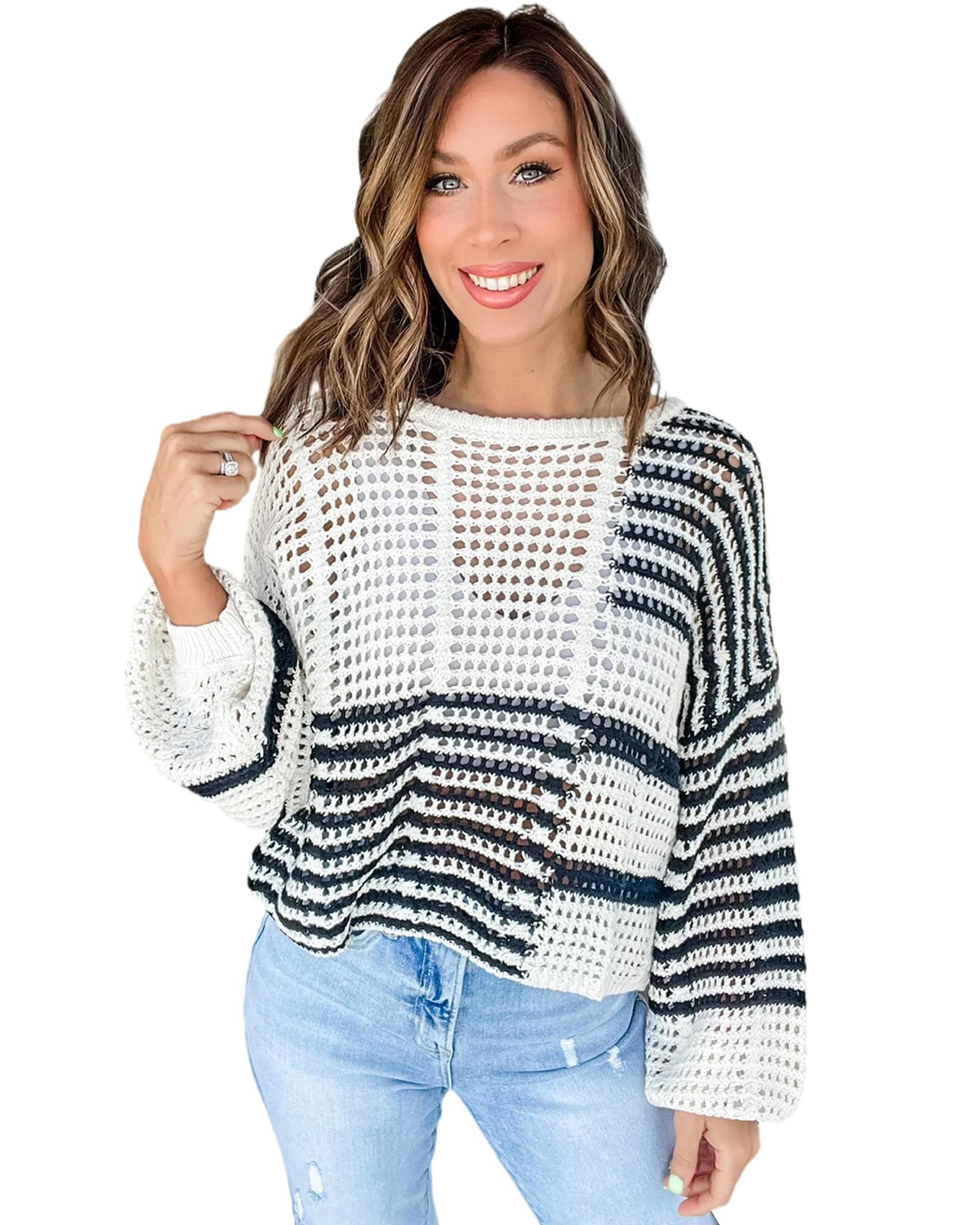 White Stripe Contrast Striped Crochet Puff Sleeve Sweater – XL