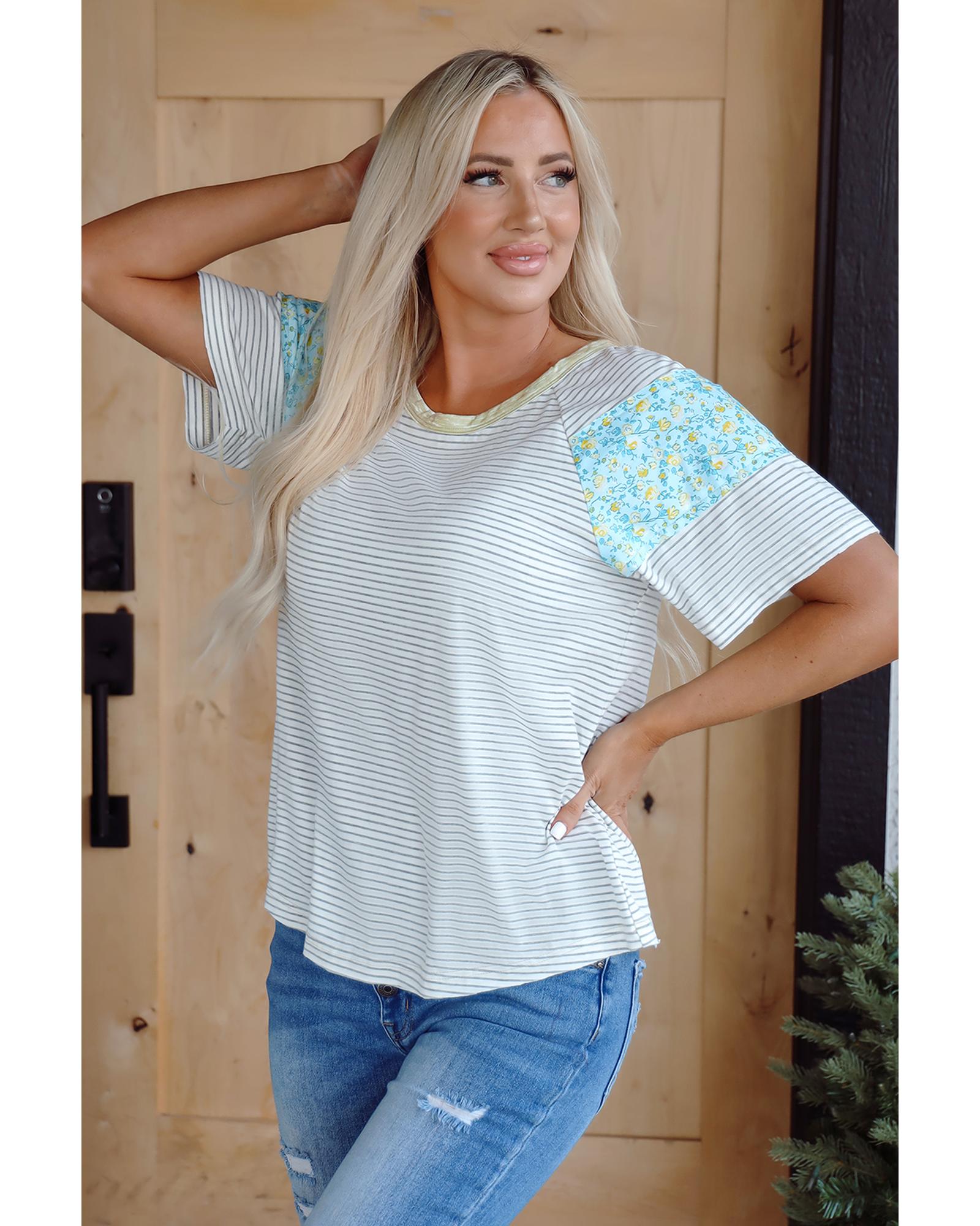 White Stripe Floral Insert Sleeves Contrast Round Neck Tee – XL