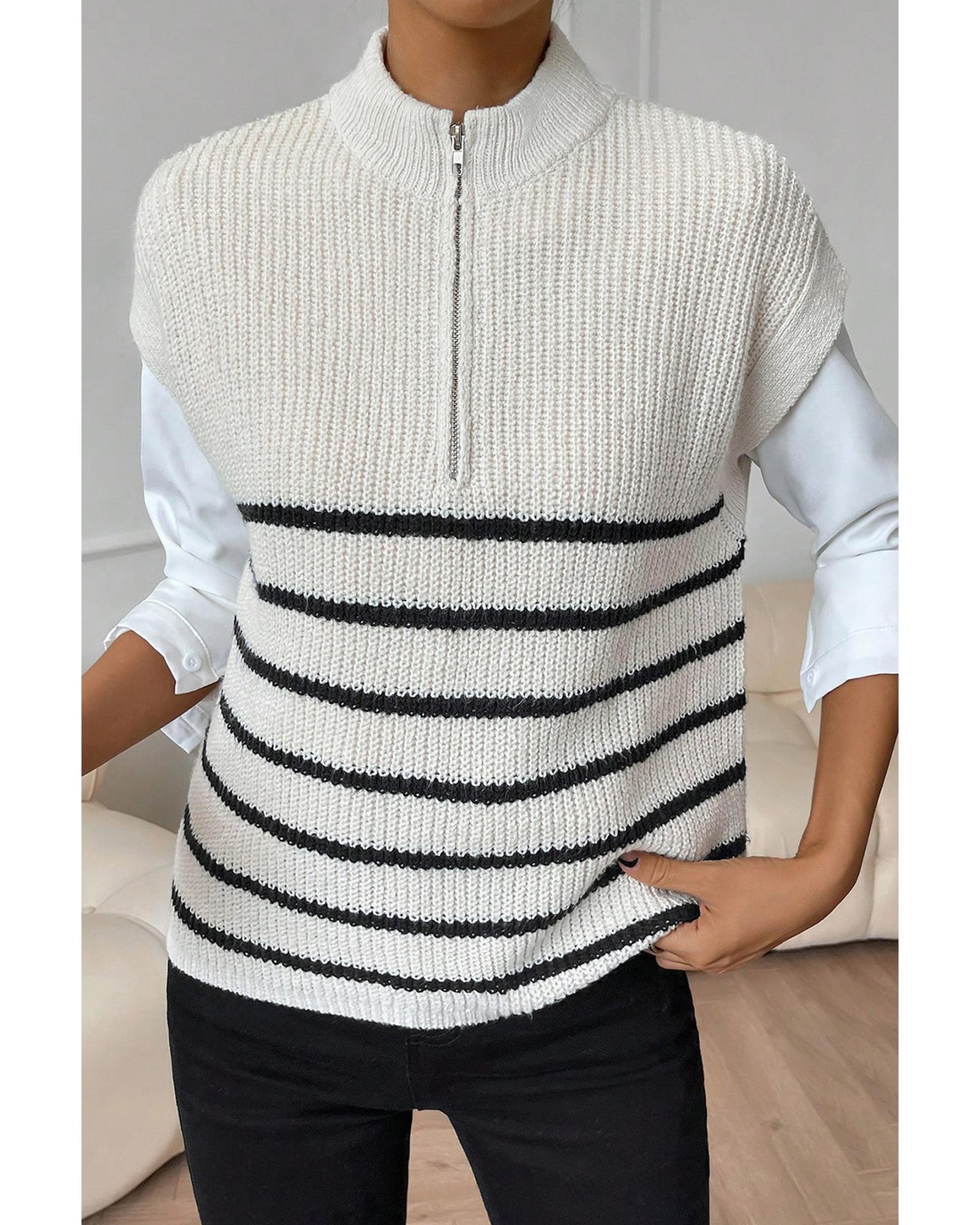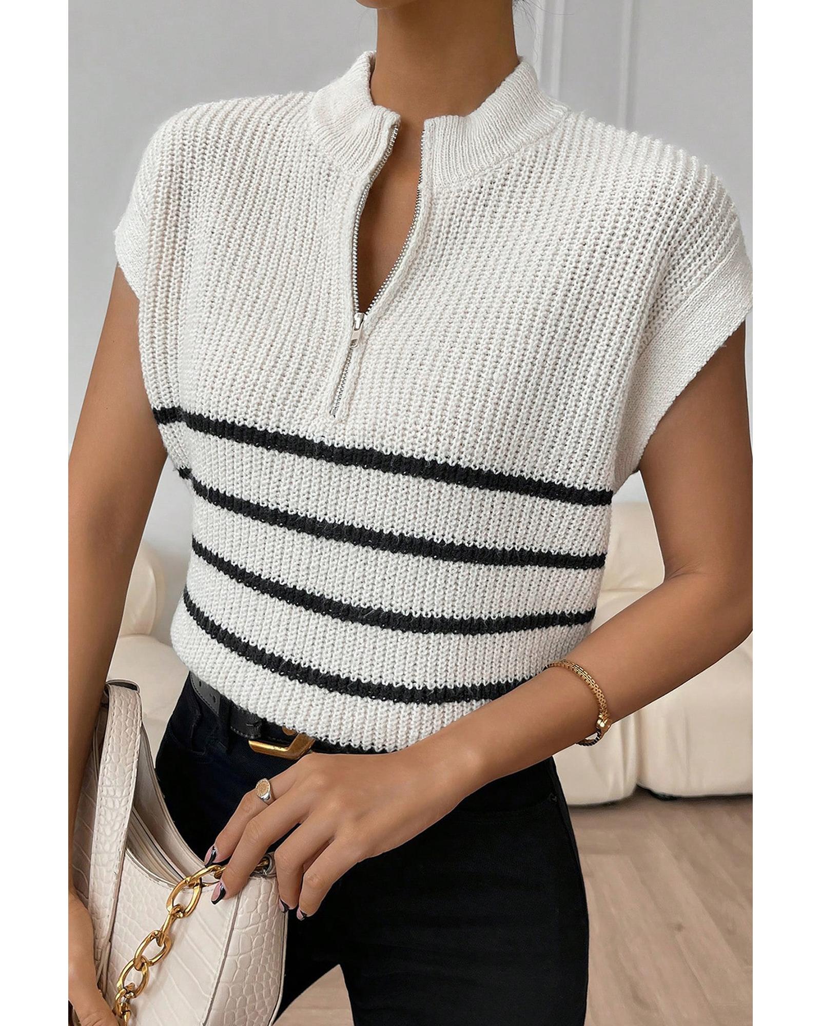 White Stripe Half Zip Split Stand Neck Sweater T-shirt – L