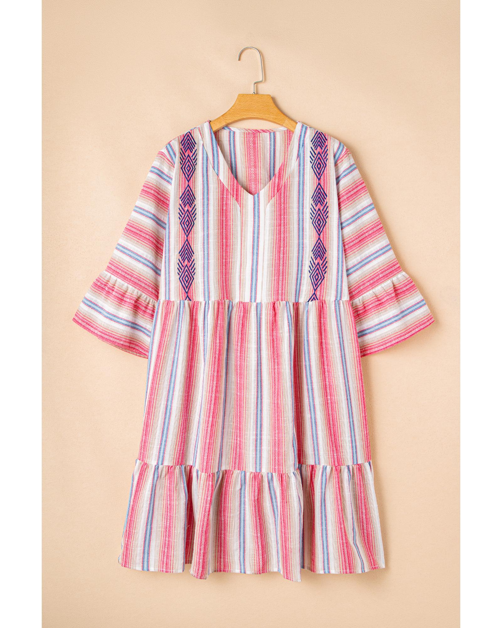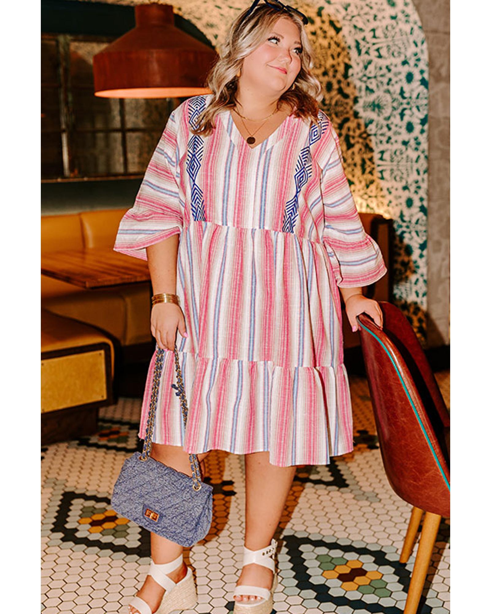White Stripe Plus Size Embroidered Detail Flared 3/4 Sleeve V Neck Dress – 4X