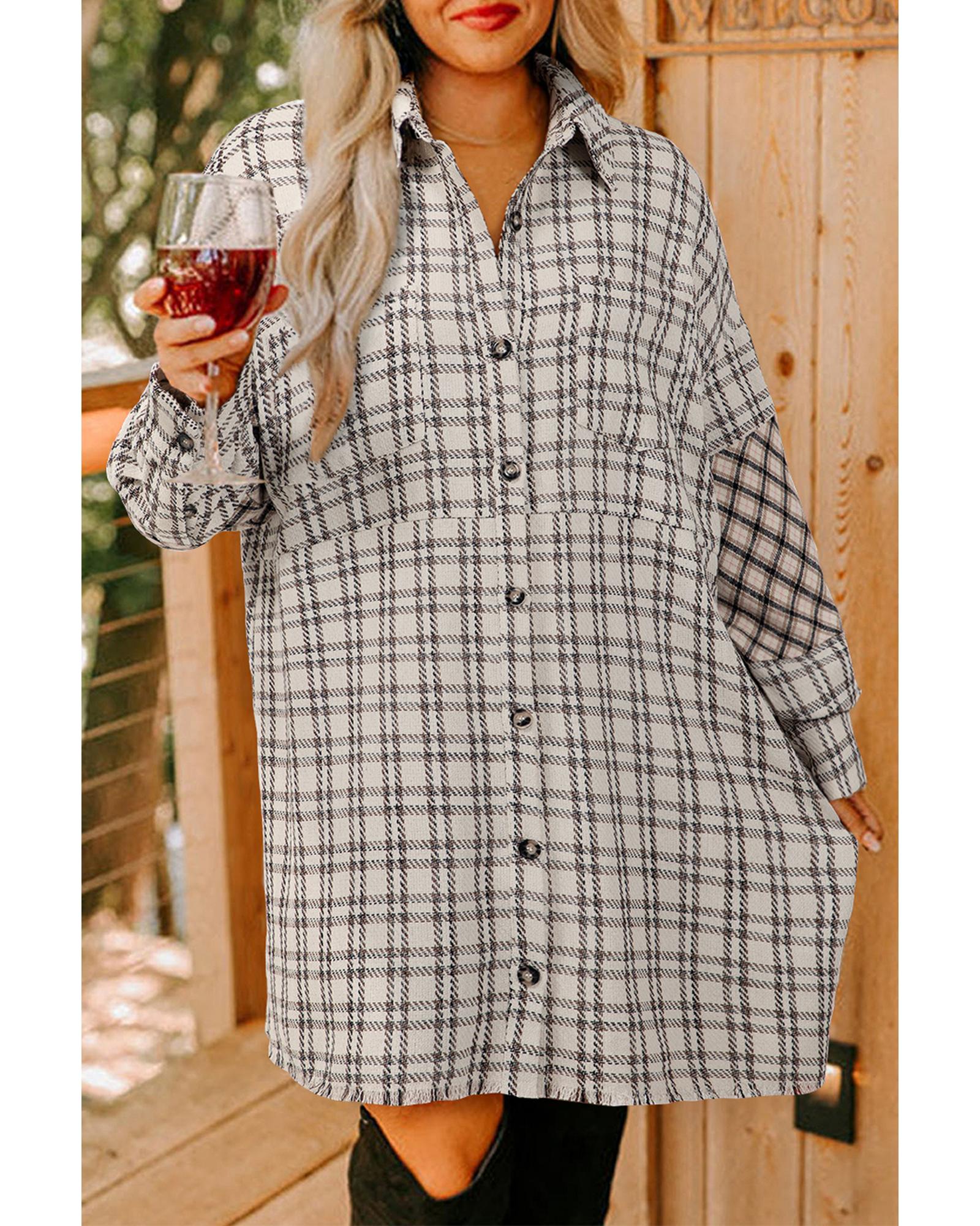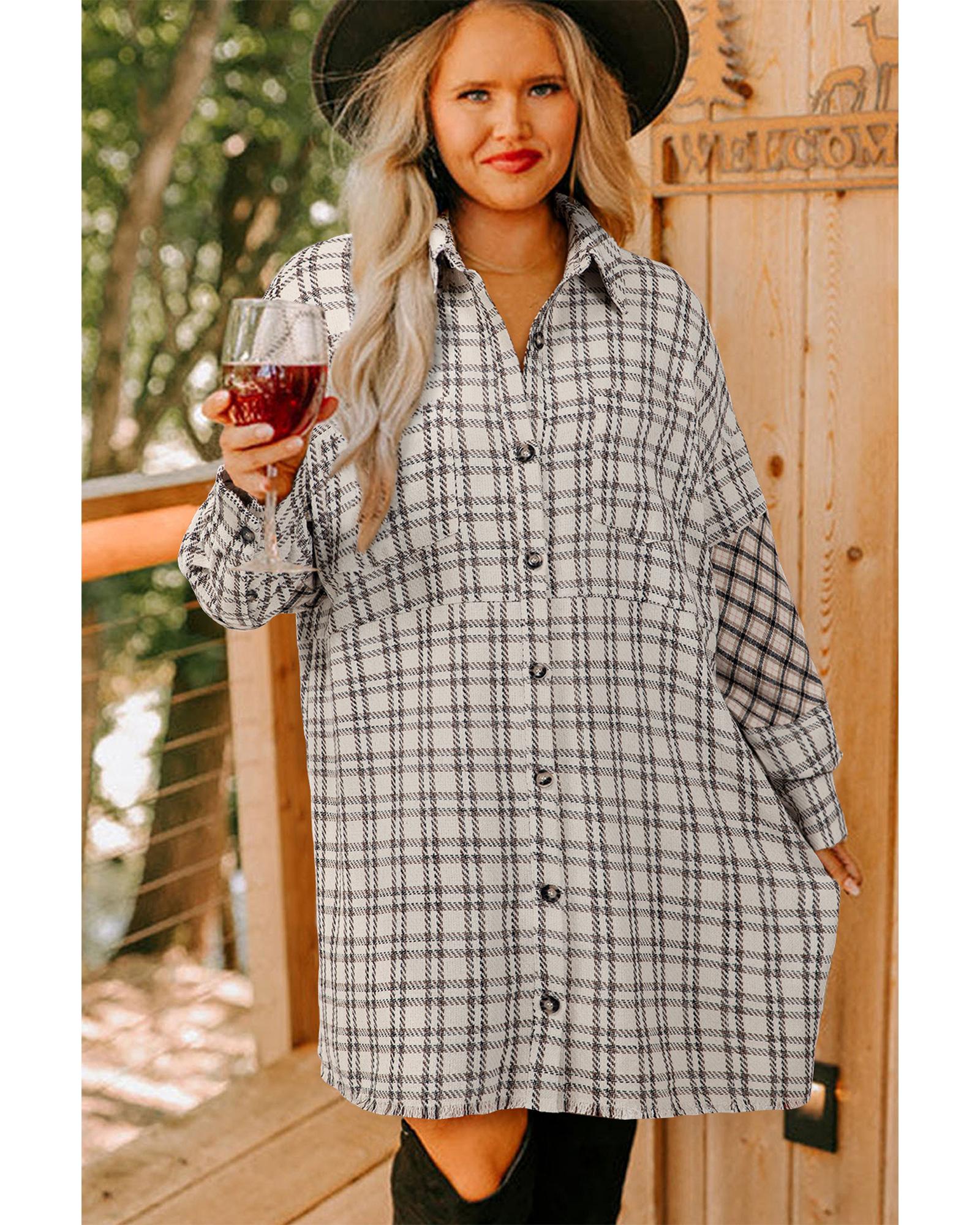 White Stripe Plus Size Plaid Buttoned Raw Hem Tunic Shirt Dress – 2X