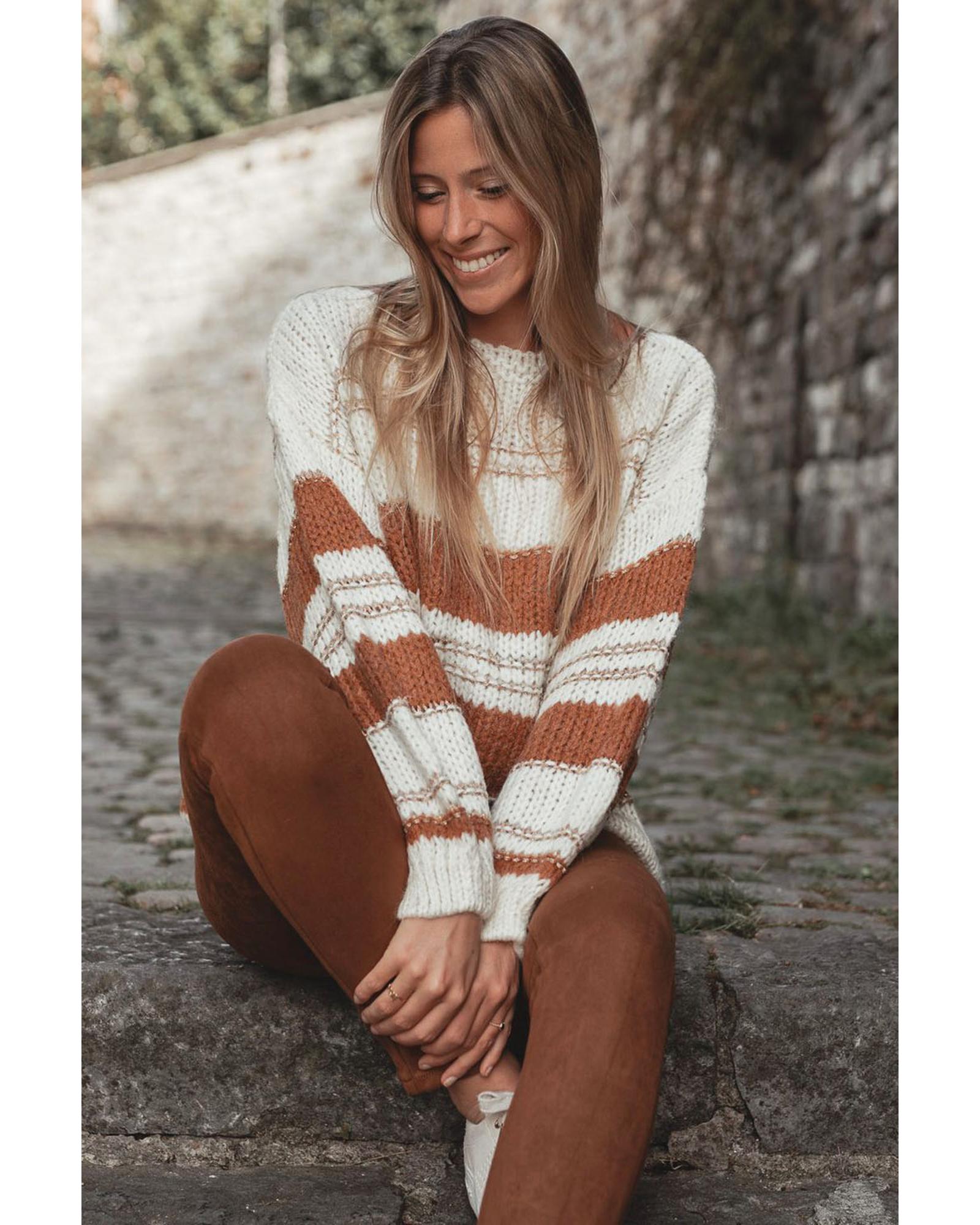 White Striped Knit Puff Sleeve Casual Sweater – M