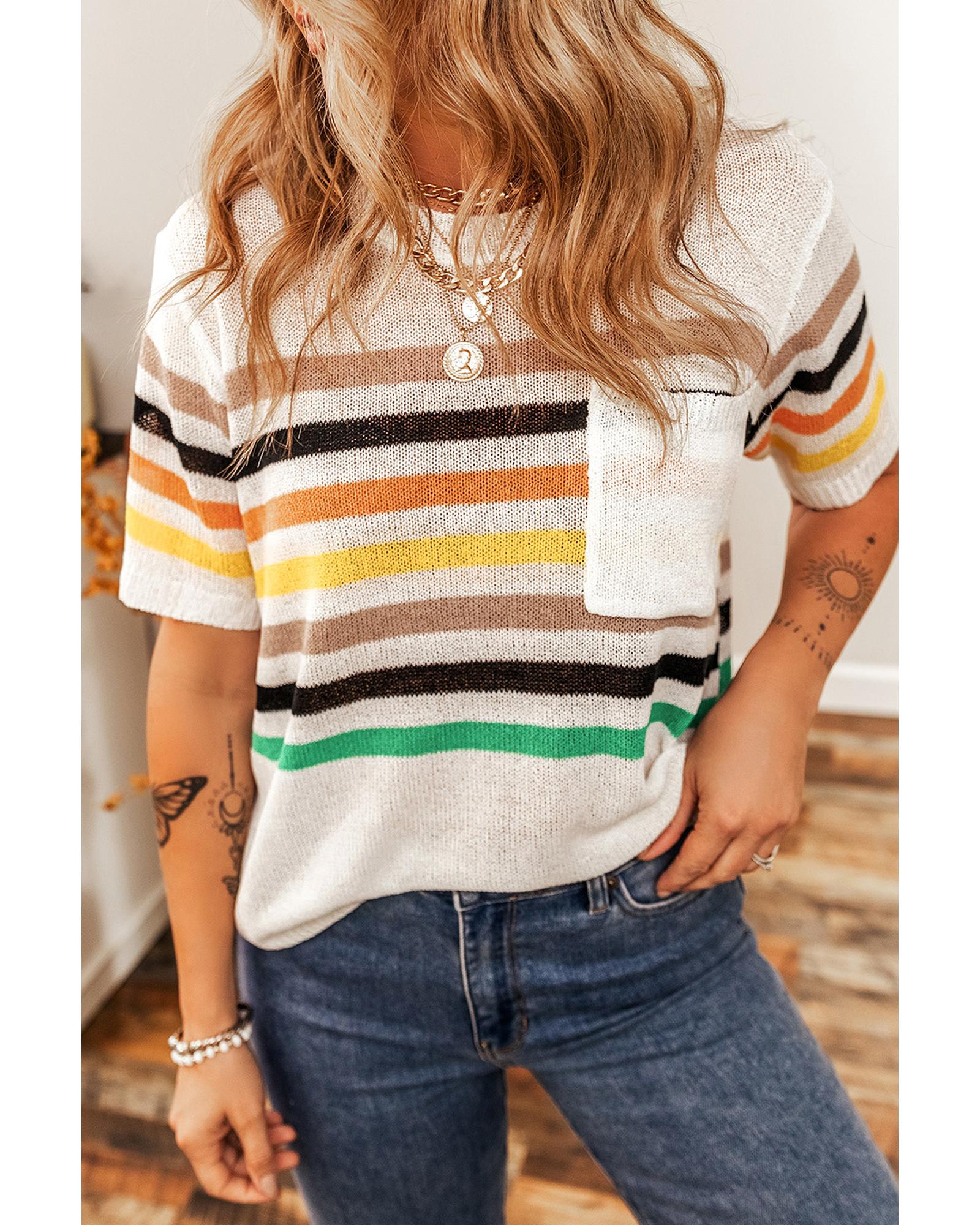 White Striped Pocketed Loose Fit Crewneck Knitted T Shirt – S