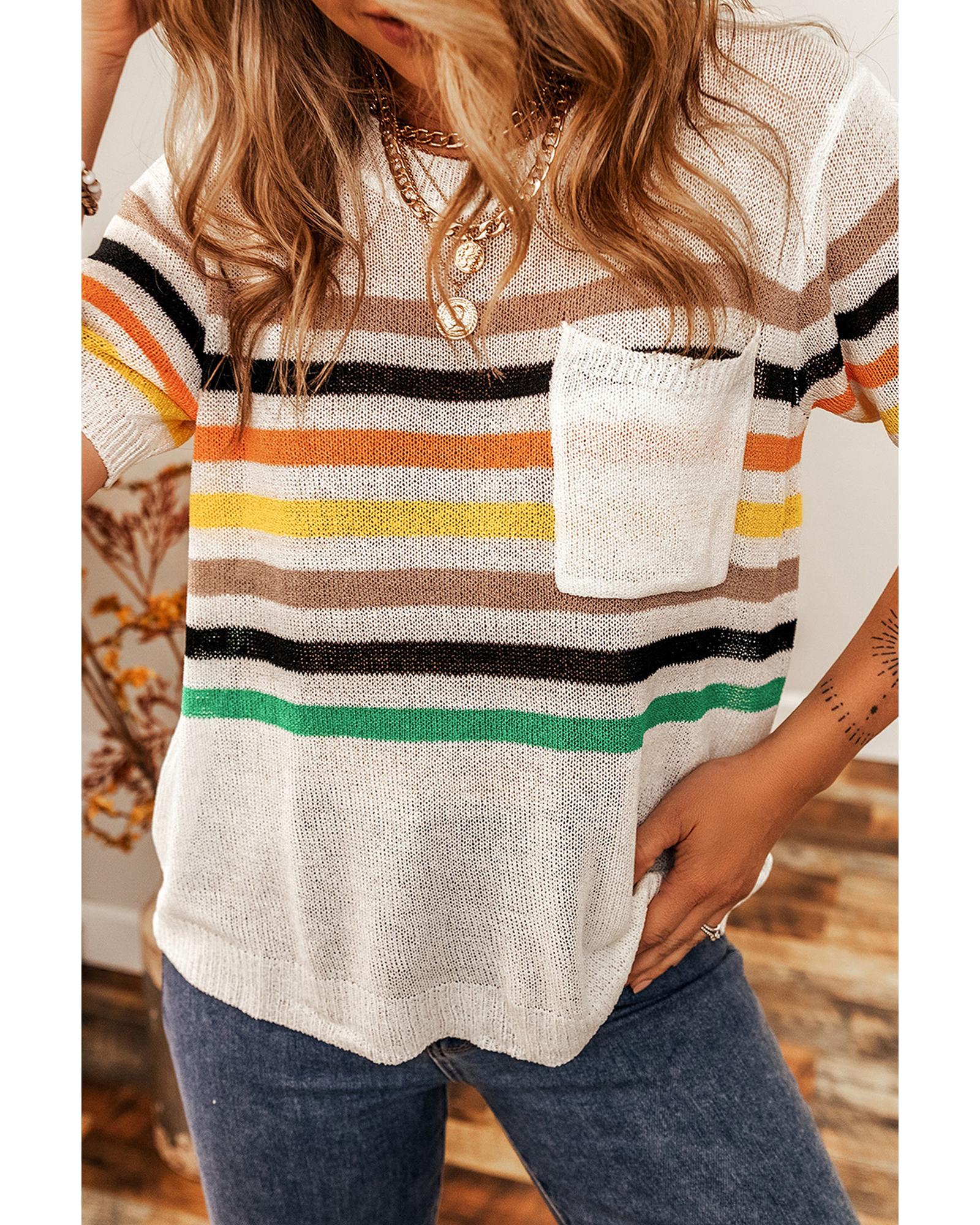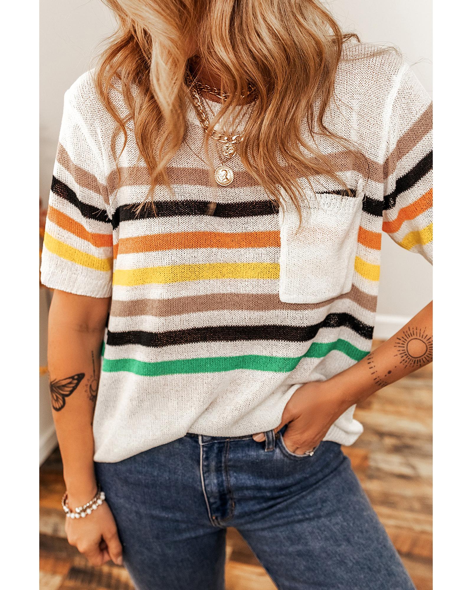 - White Striped Pocketed Loose Fit Crewneck Knitted T