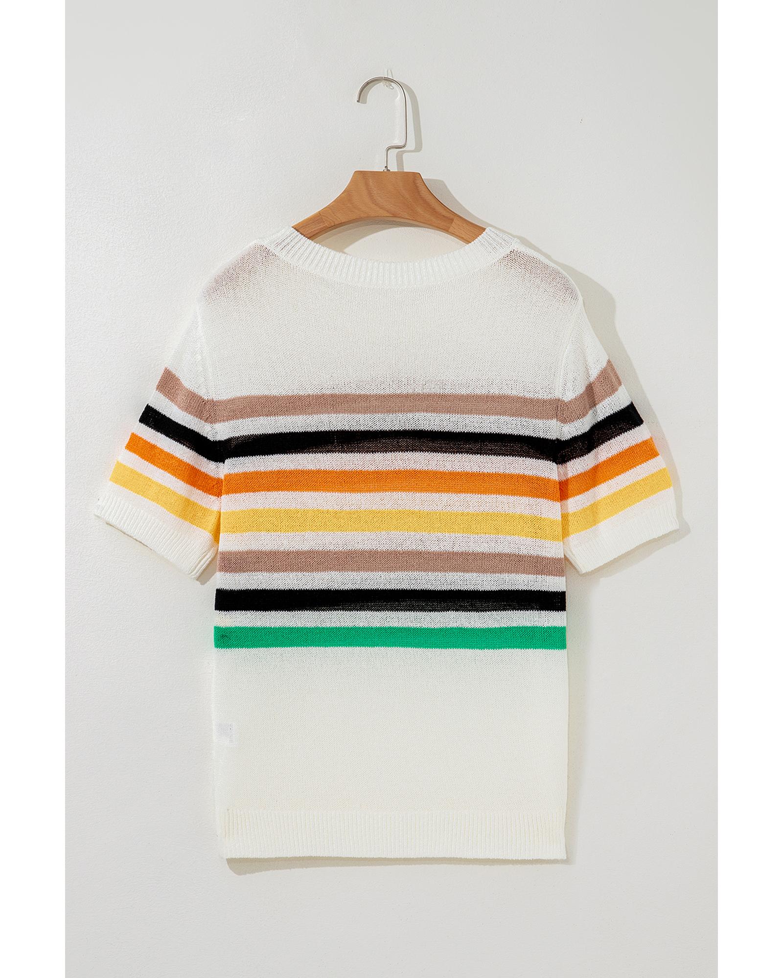 White Striped Pocketed Loose Fit Crewneck Knitted T Shirt - S