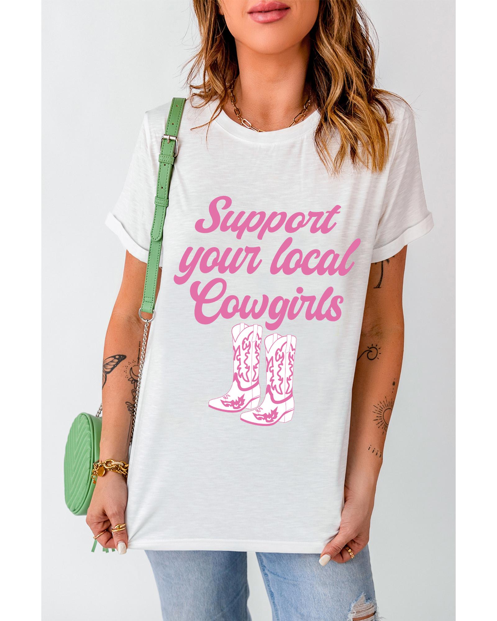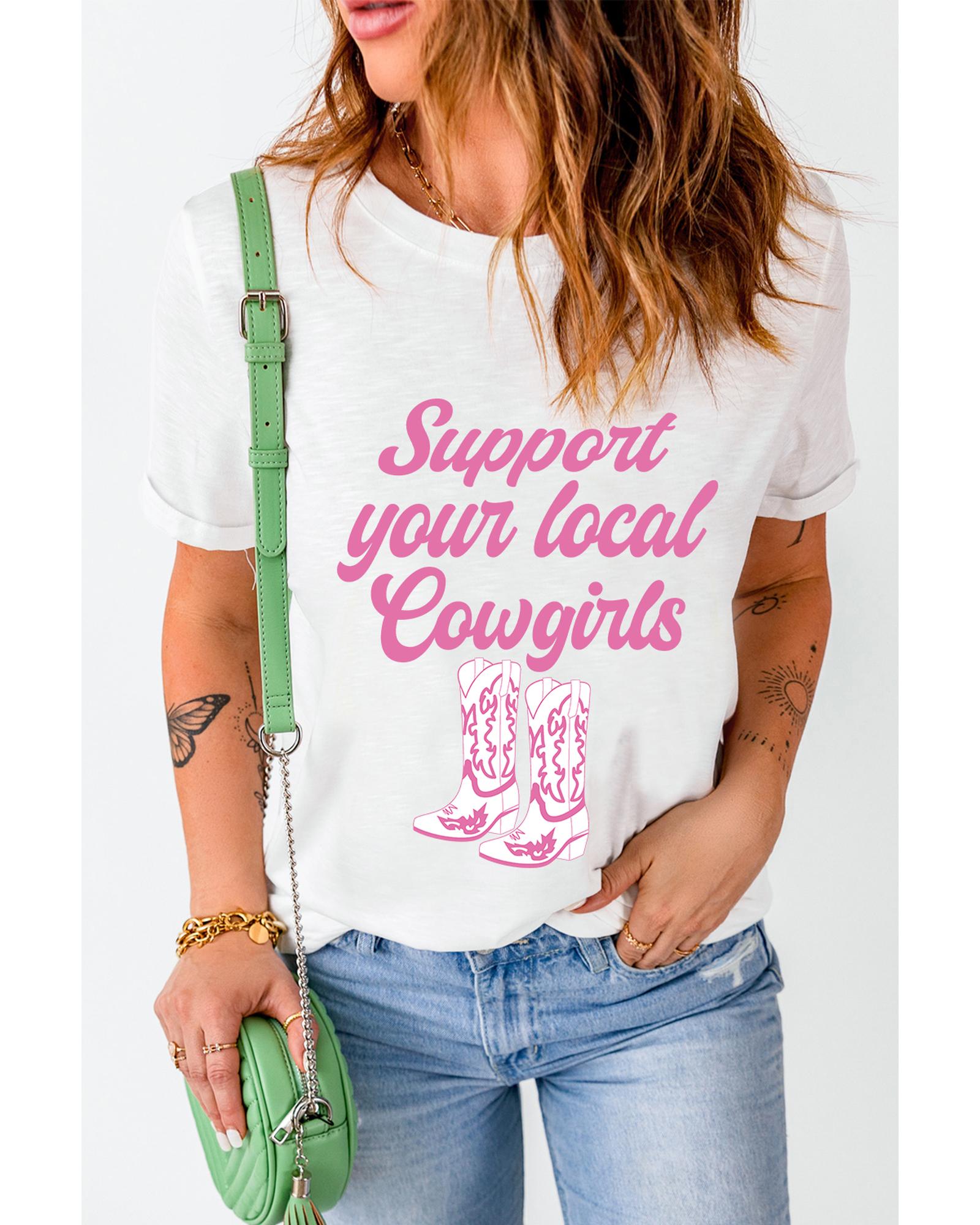 - White Support Your Local Cowgirls Boots Print Crewneck Tee