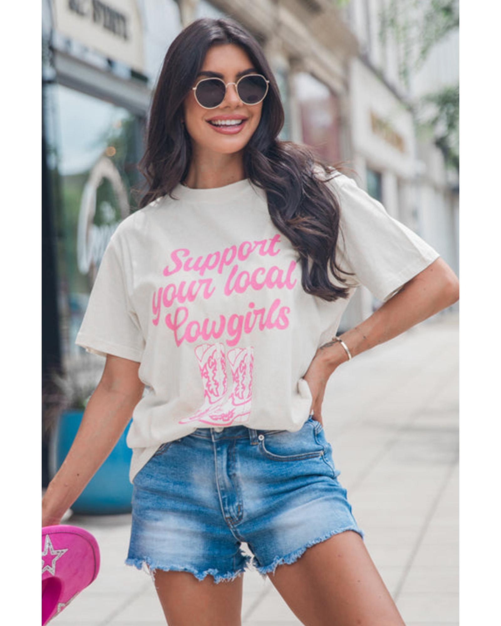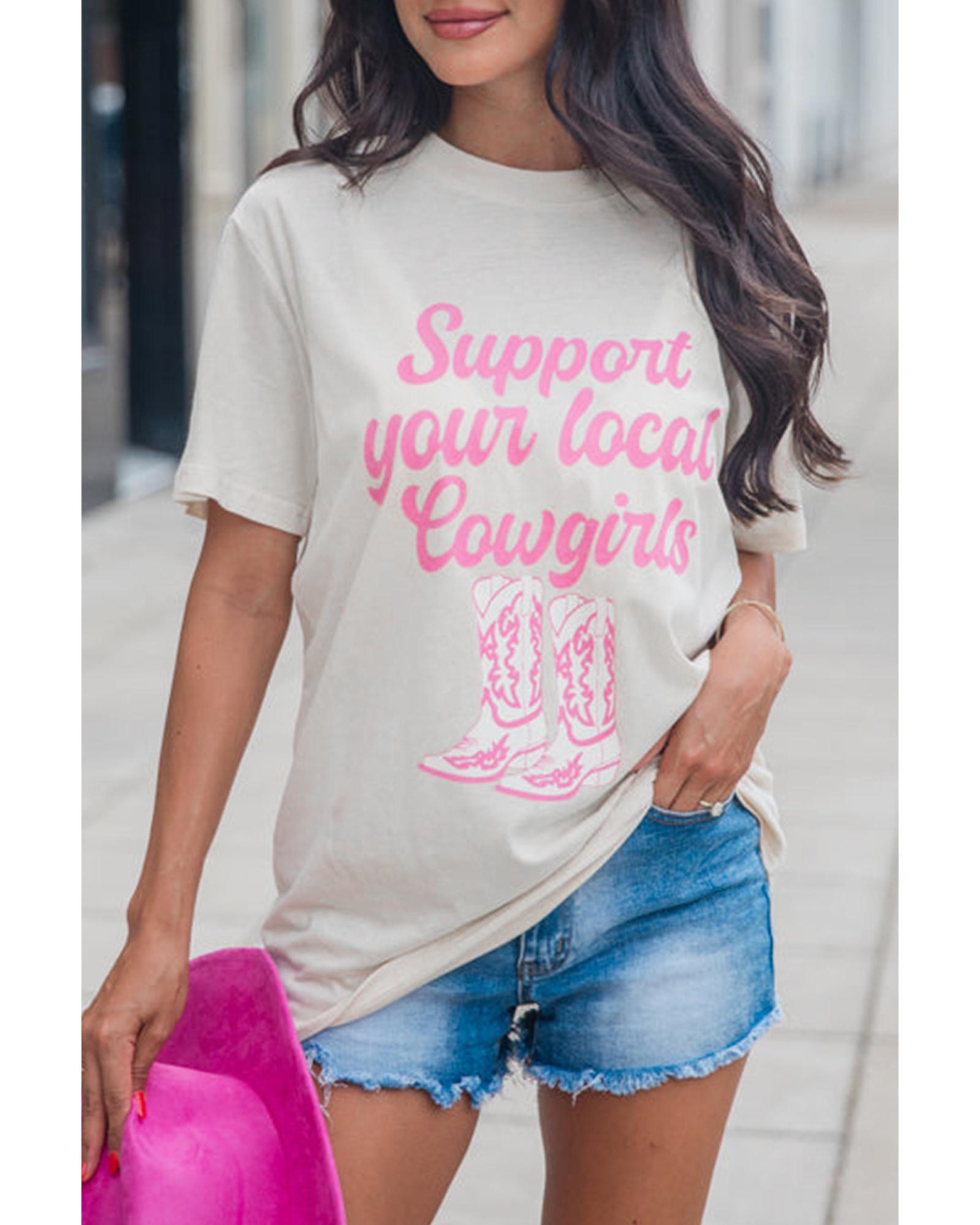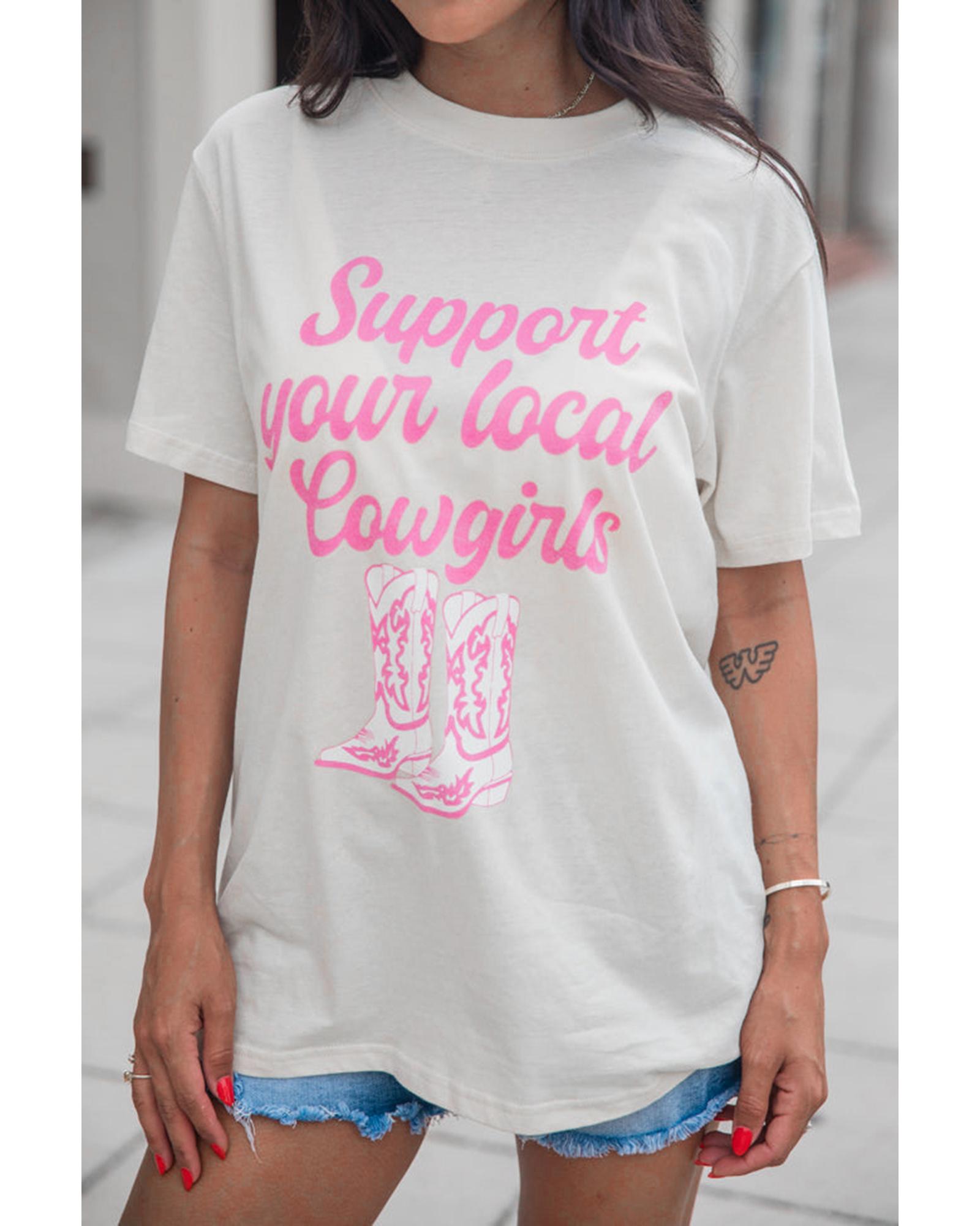 - White Support Your Local Cowgirls Boots Print Crewneck Tee