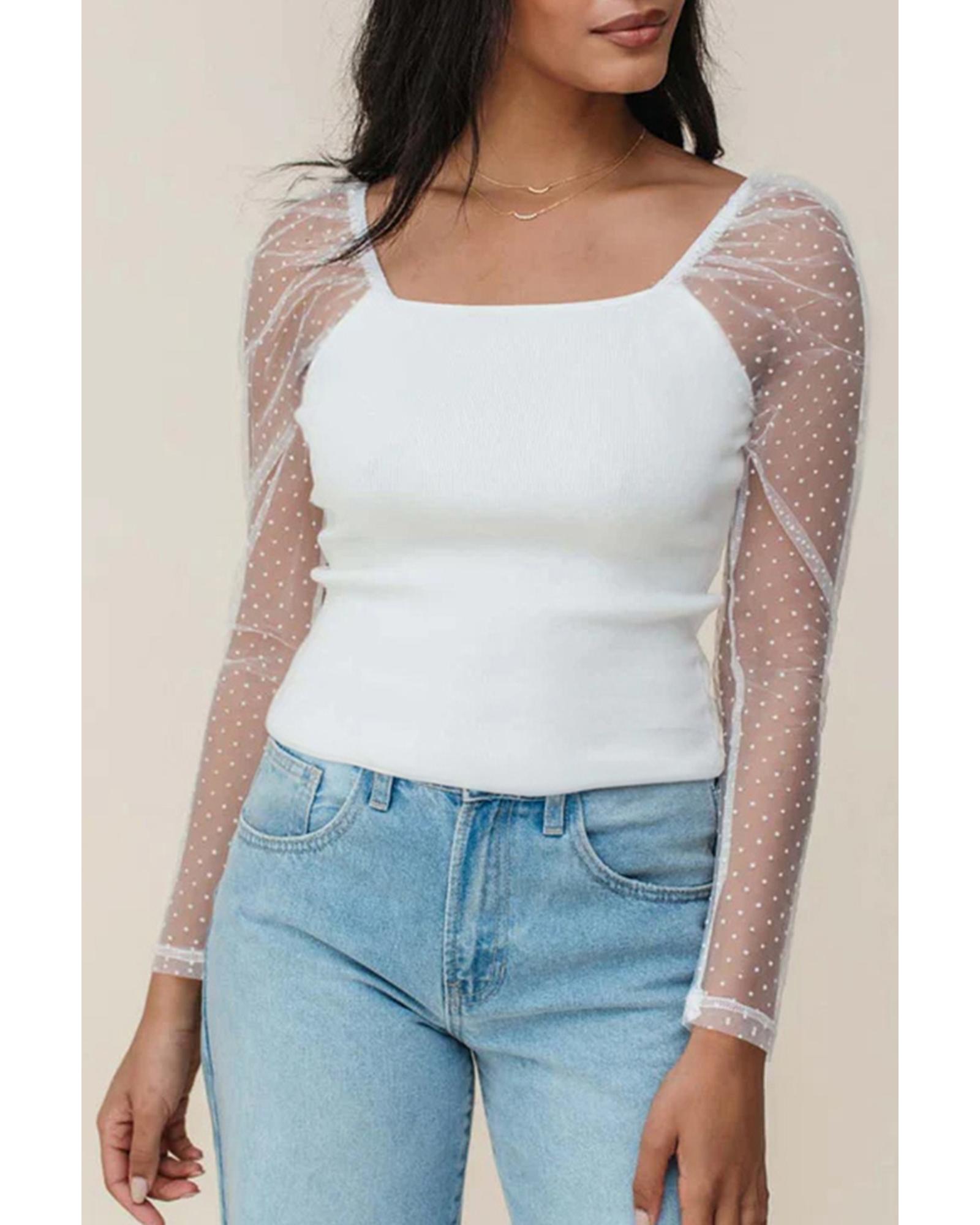 White Swiss Dot Mesh Long Sleeve Square Neck Slim Top – S