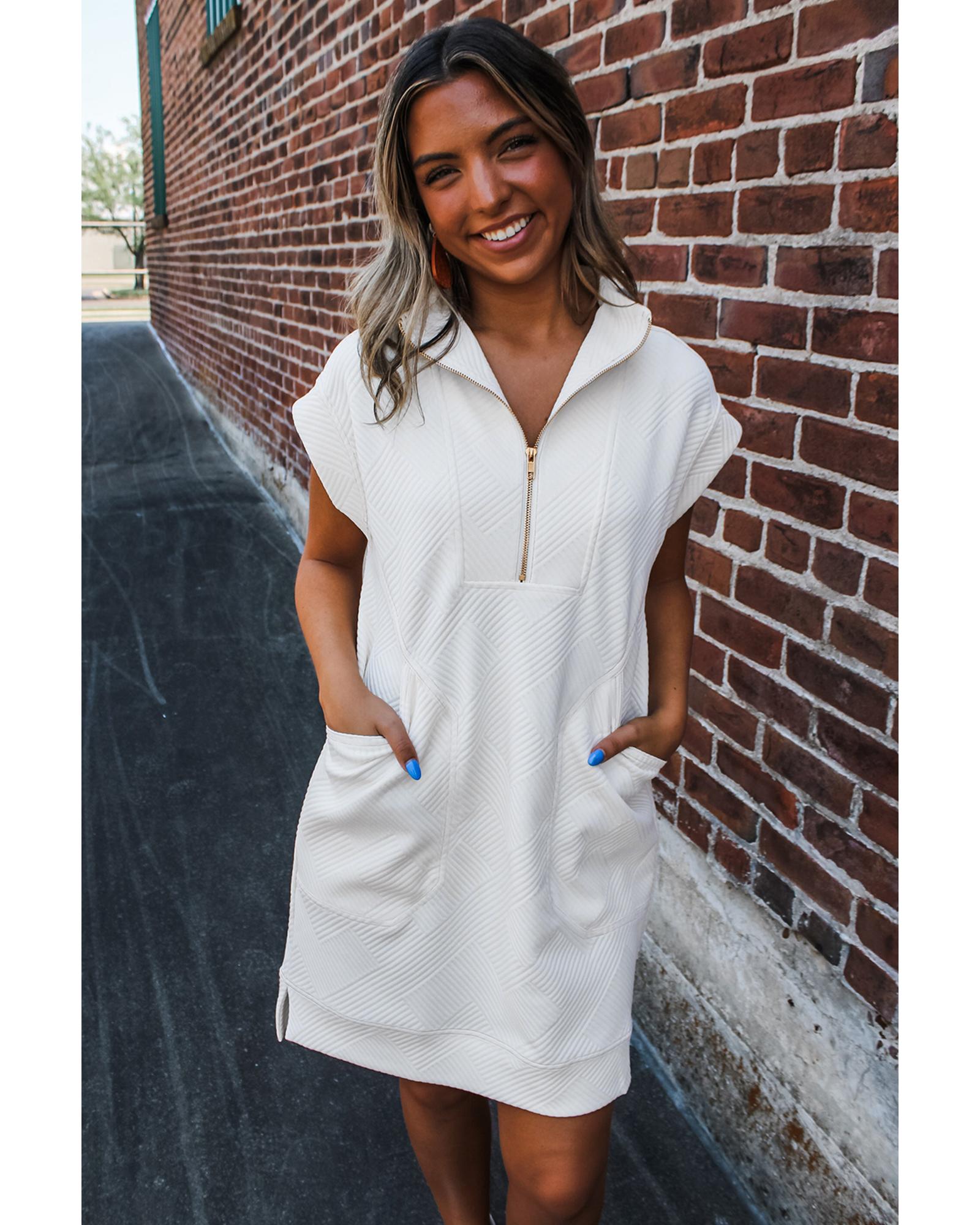 - White Textured Half Zip Collared Cap Sleeve Mini Dress