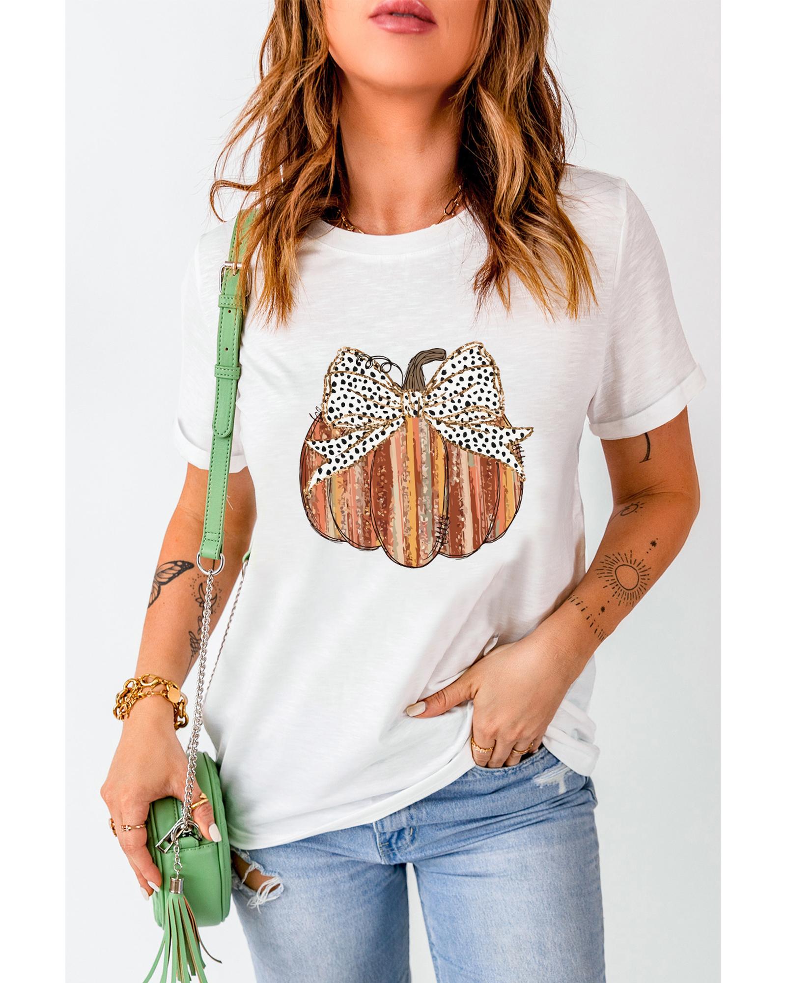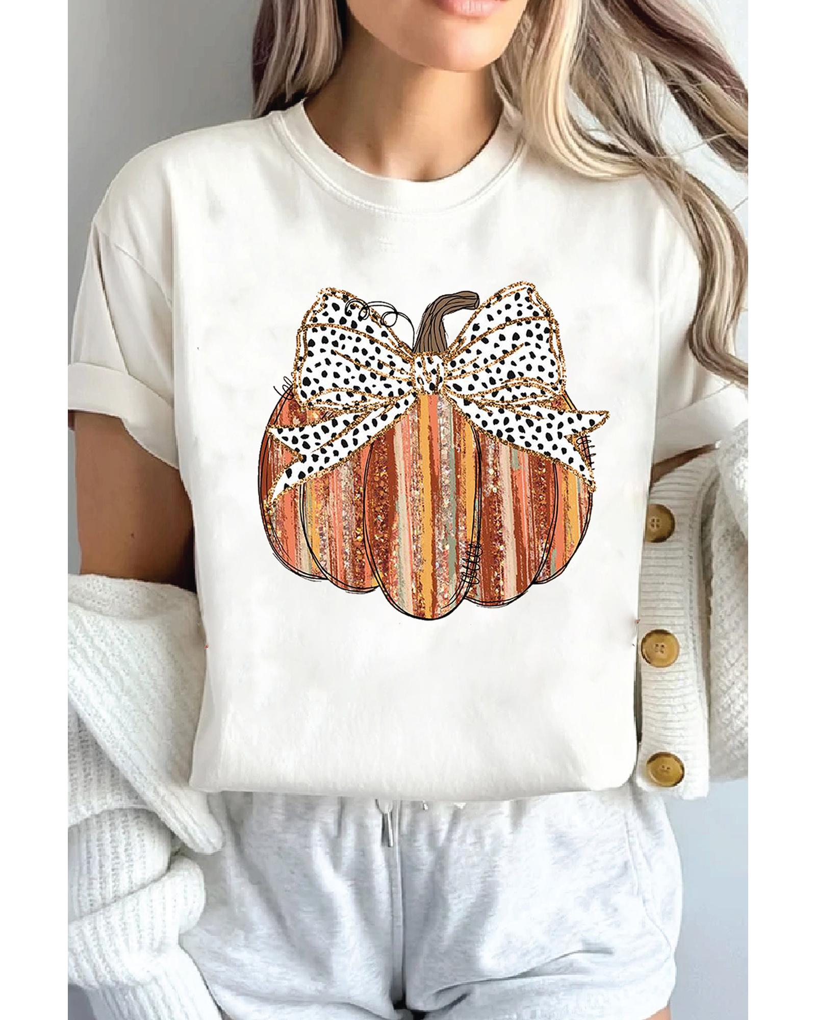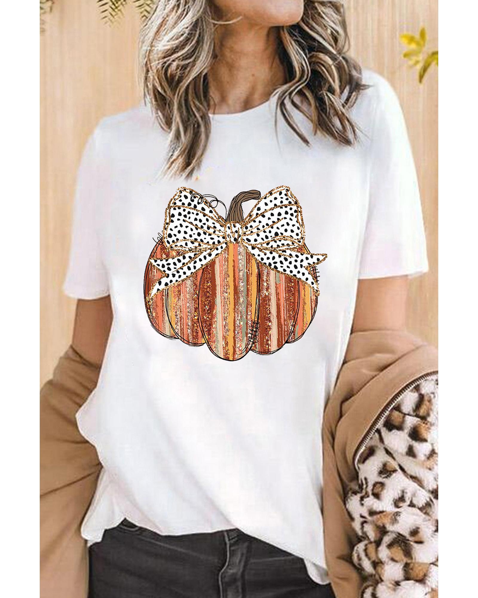 White Thanksgiving Bow Knot Pumpkin Print Round Neck T Shirt – 3XL