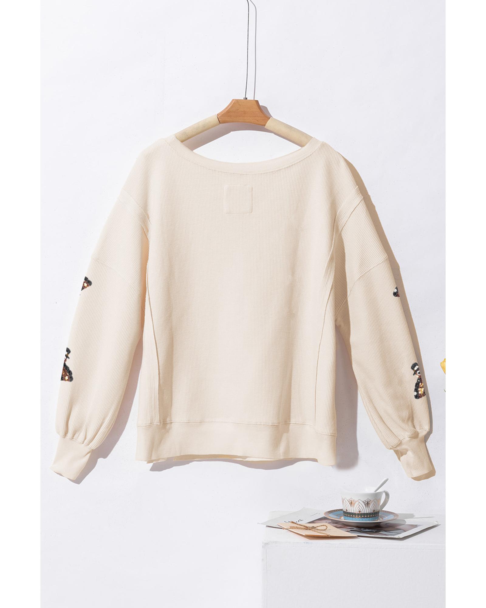 White Thanksgiving Turkey Waffle Oversized Knit Top Sequin graphic shimmers in the light Oversized design for a comfortable fit Dropped puff sleeves for added style Slit details on the sleeves Long - sleeve pullover