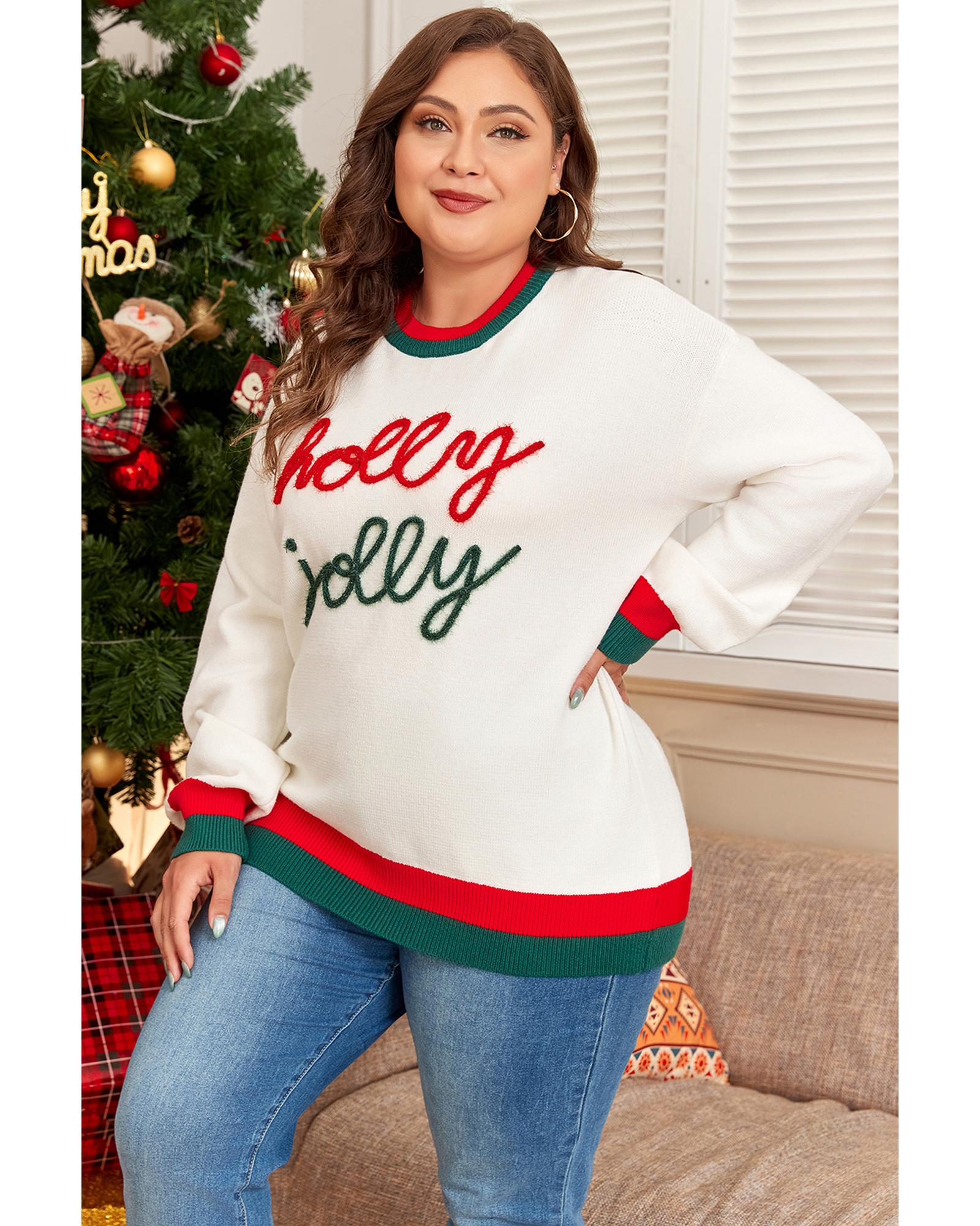 - White Tinsel Holly Jolly Pattern Colorblock Edge Drop Shoulder Plus Size Sweater