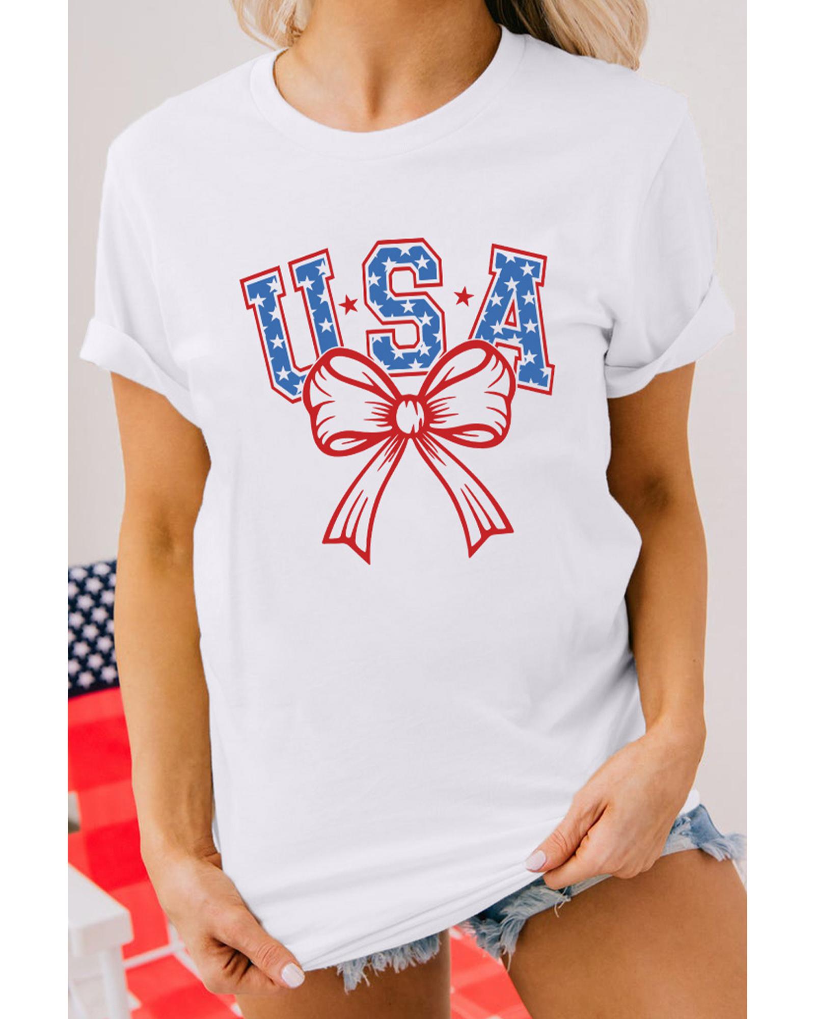 White USA Bow Letter Graphic Short Sleeve Top – XL