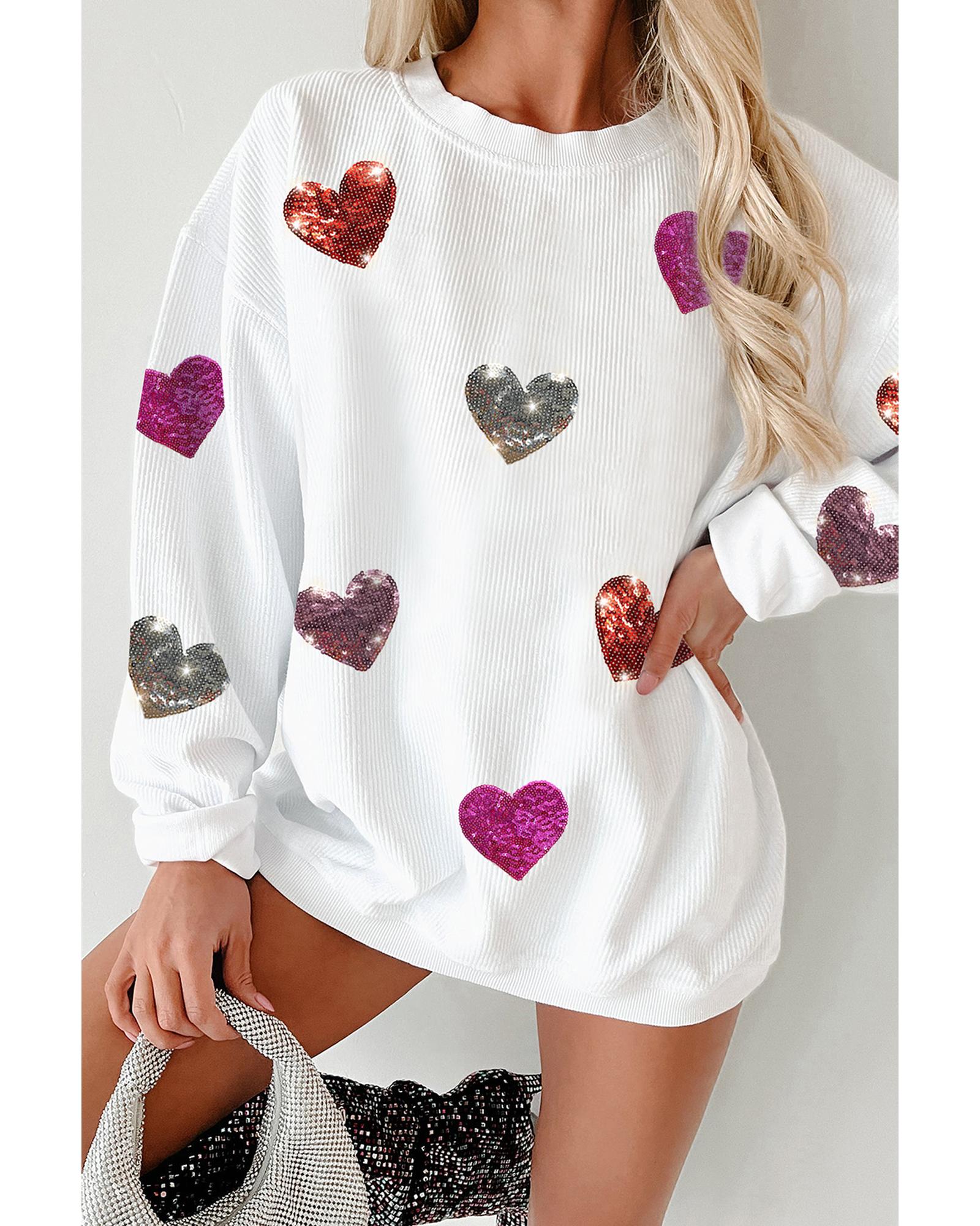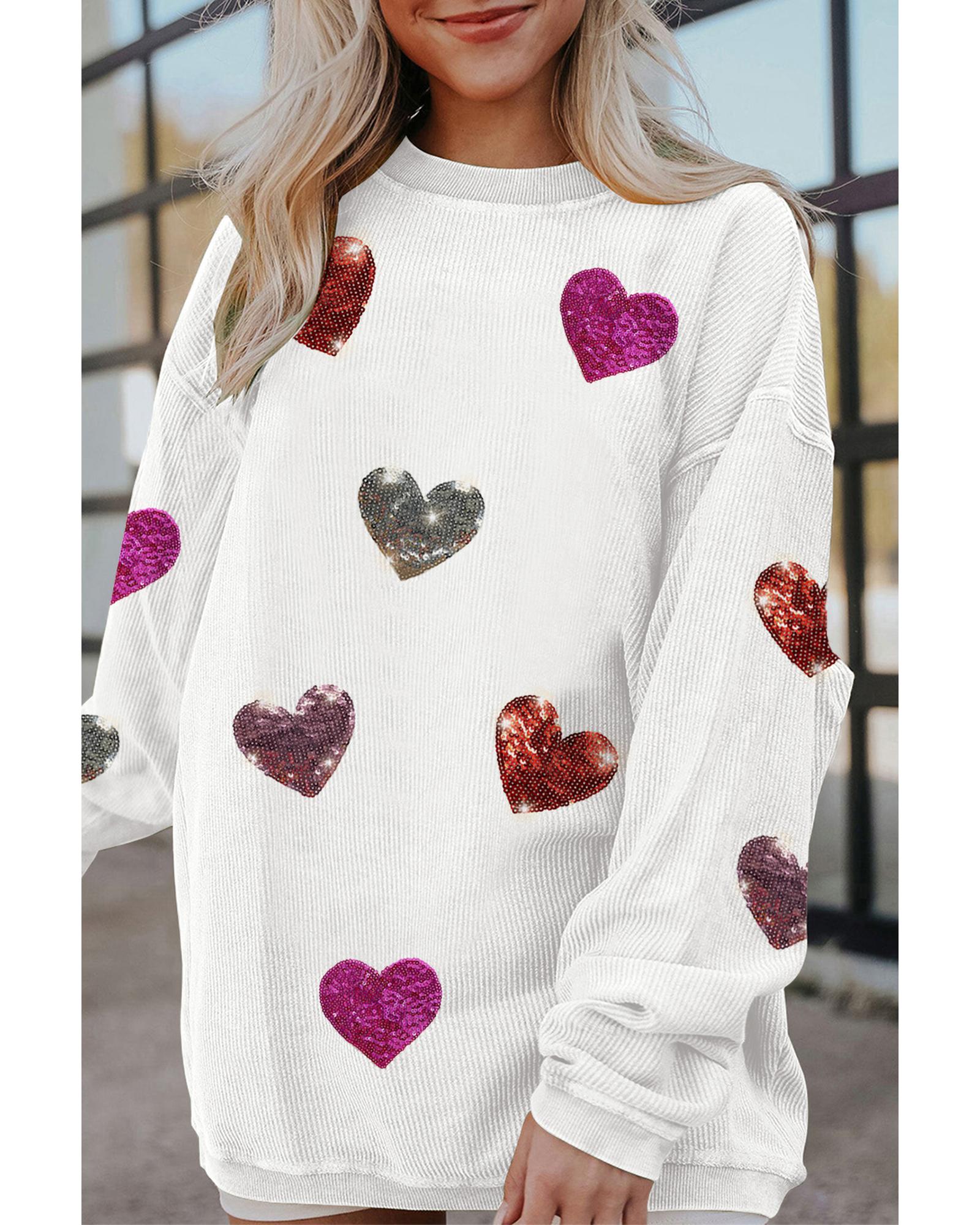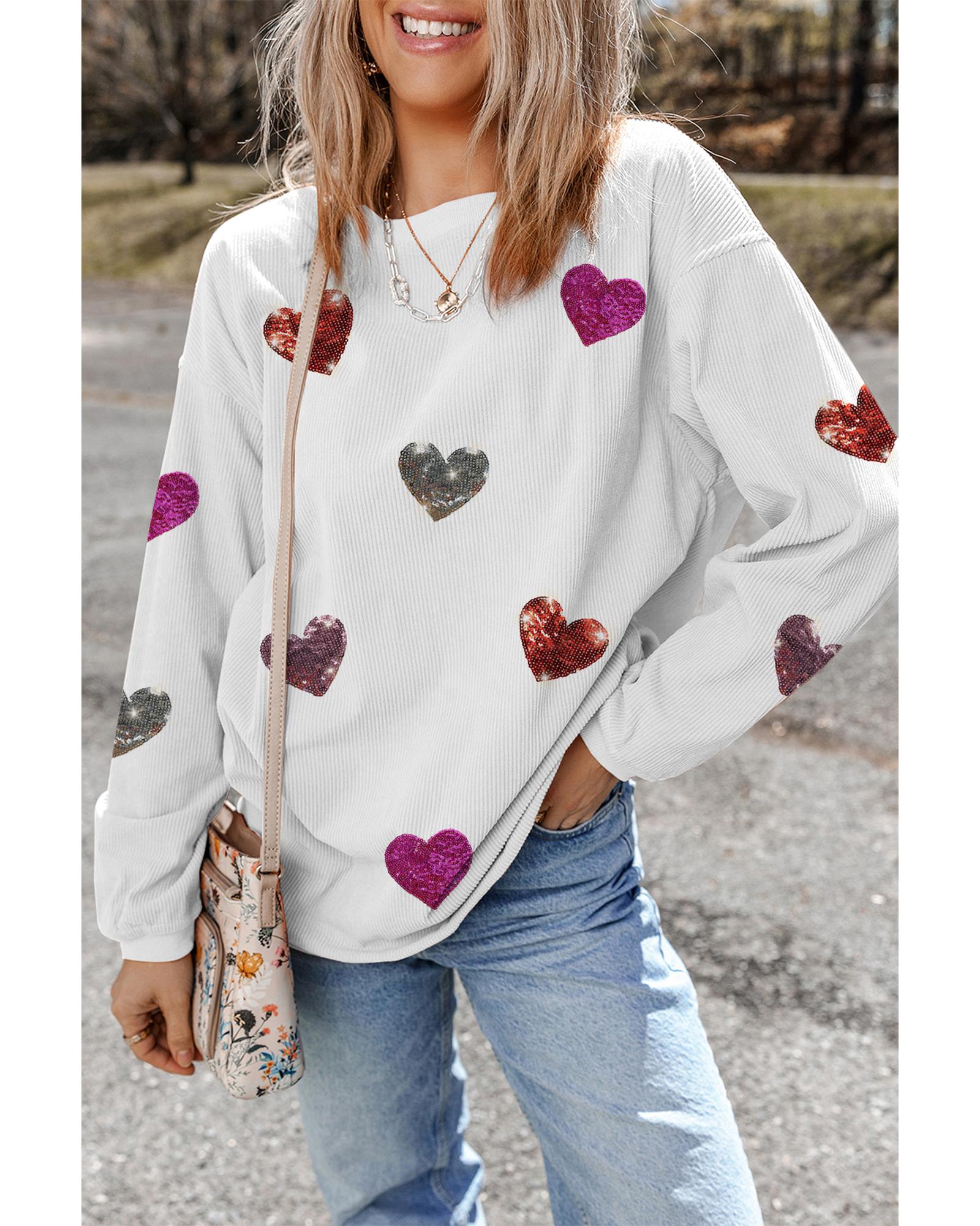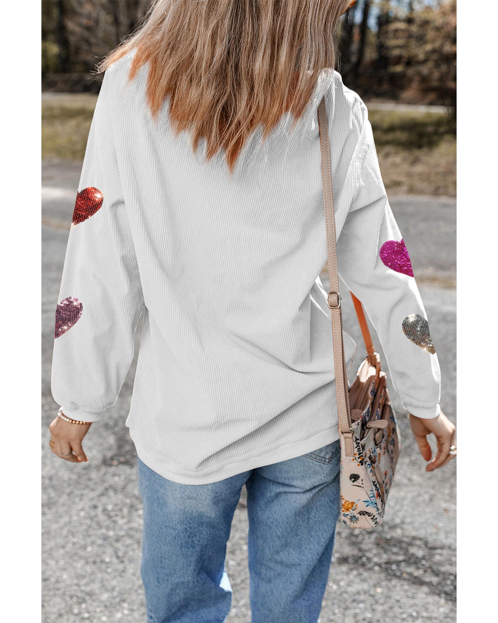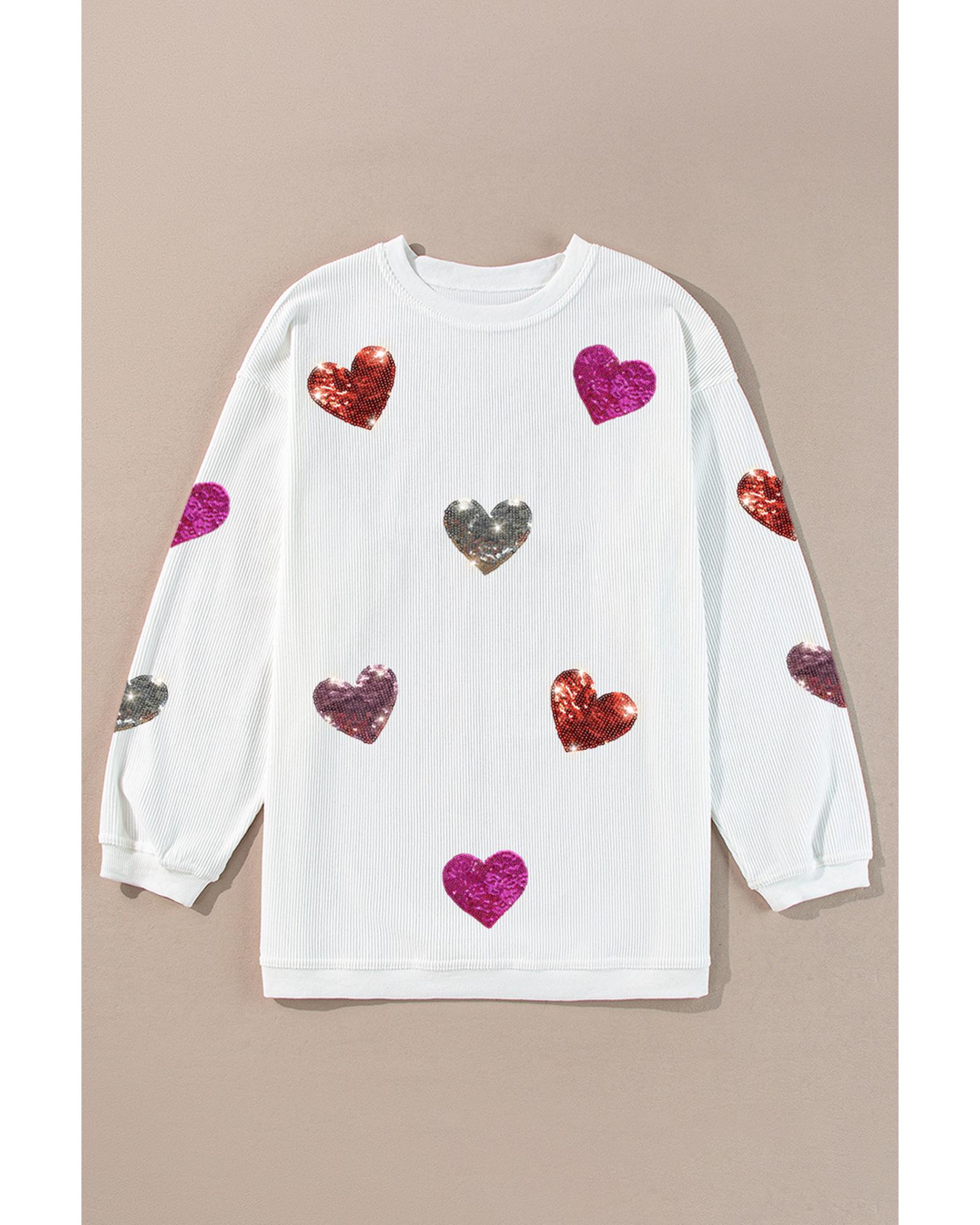 White Valentines Heart Patched Pattern Corded Pullover Sweatshirt – L