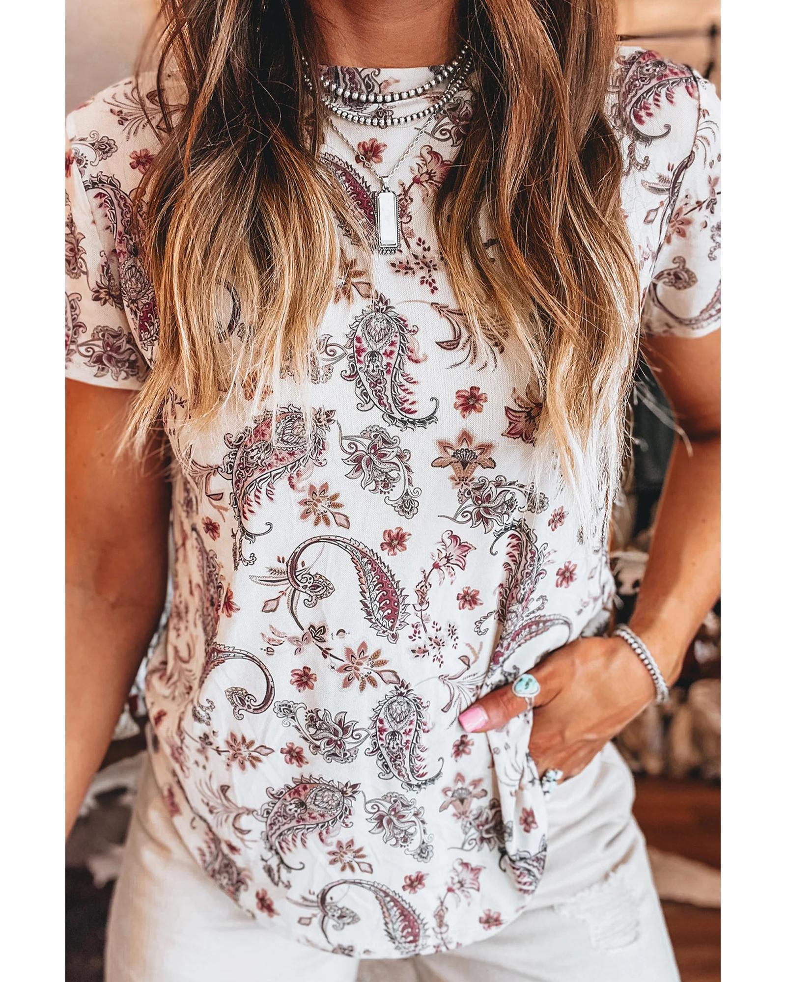 White Vintage Paisley Mock Neck T Shirt – M