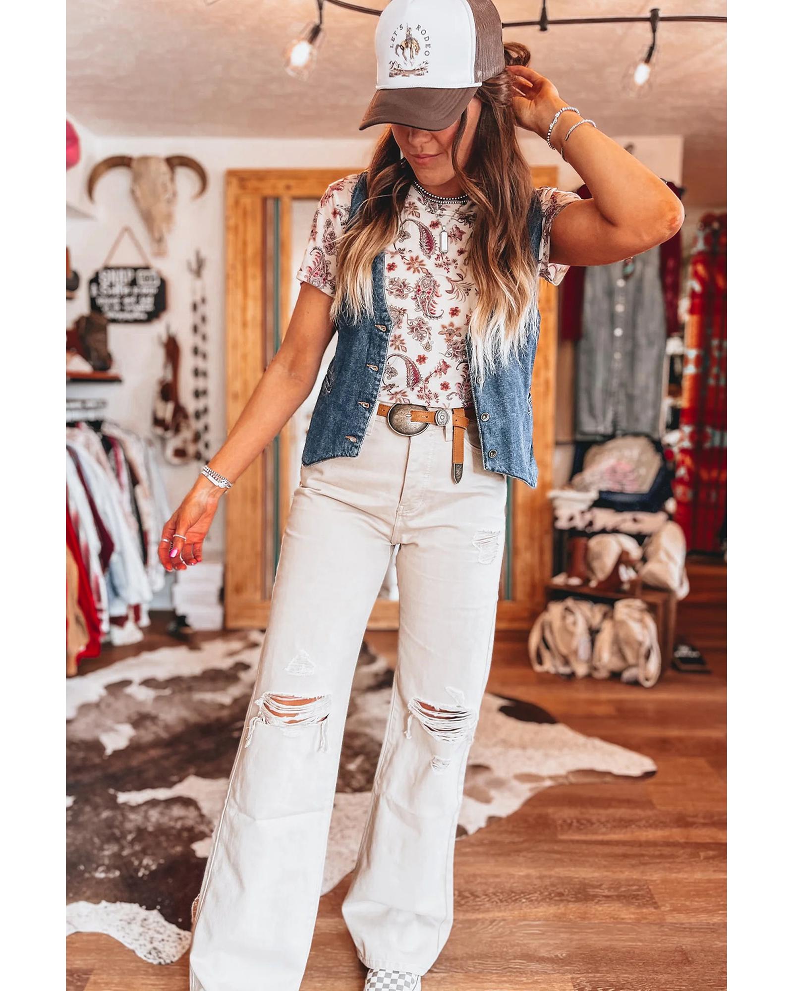 Multicolour Abstract Print Lace Detail Shirred Short Sleeve Split Neck Blouse - L