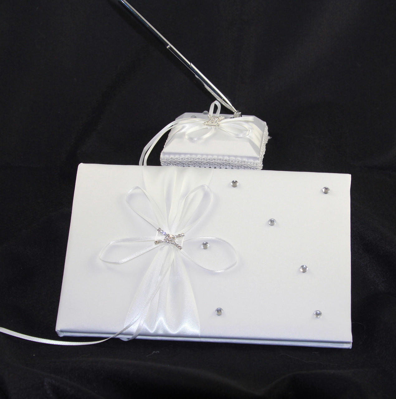 White Wedding Guest Book Register with Silver Pen Matching Stand Set 36 Lined Pages – White Ribbon and Diamante Bow Cover