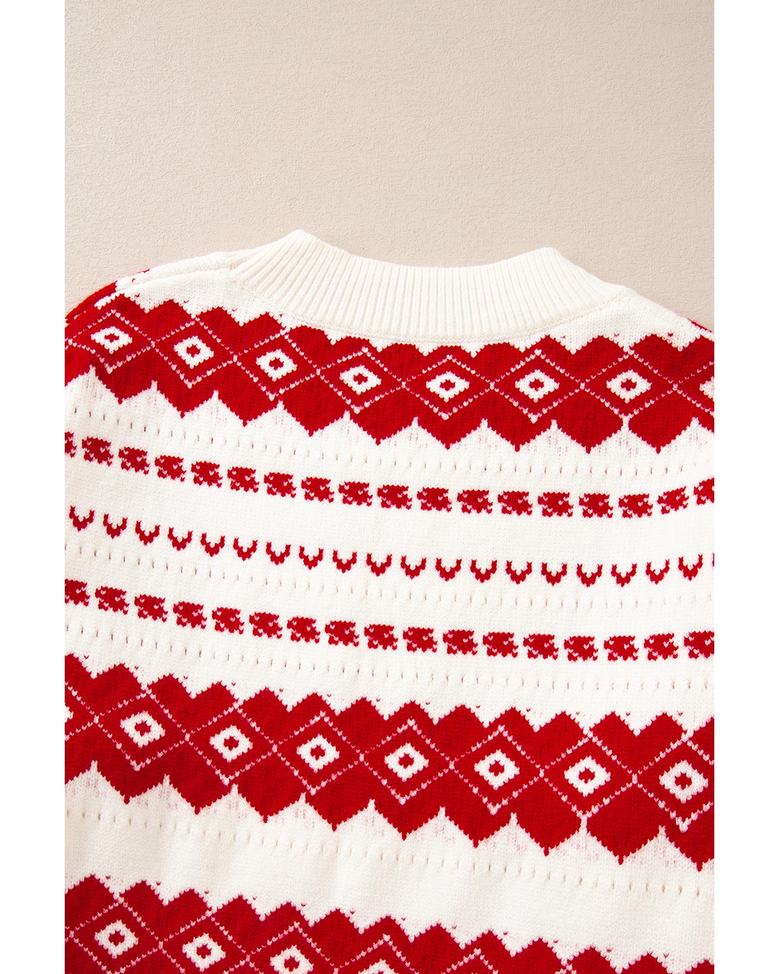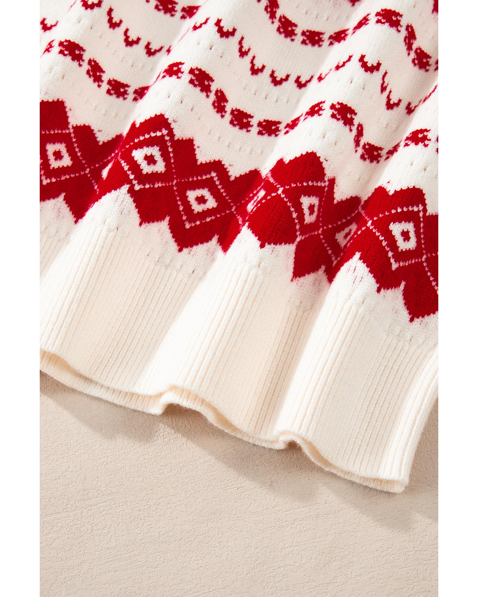 White Western Geometric Patterned Crew Neck Loose Sweater – M
