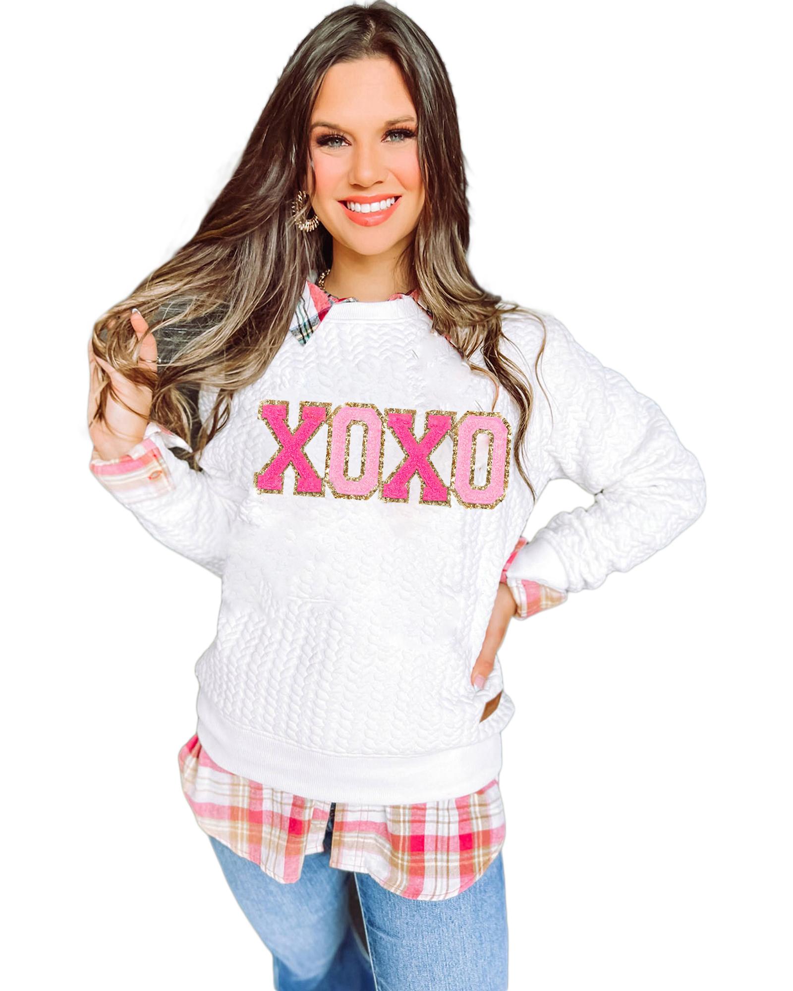 White XOXO Glitter Chenille Cable Knit Pullover Sweatshirt – L