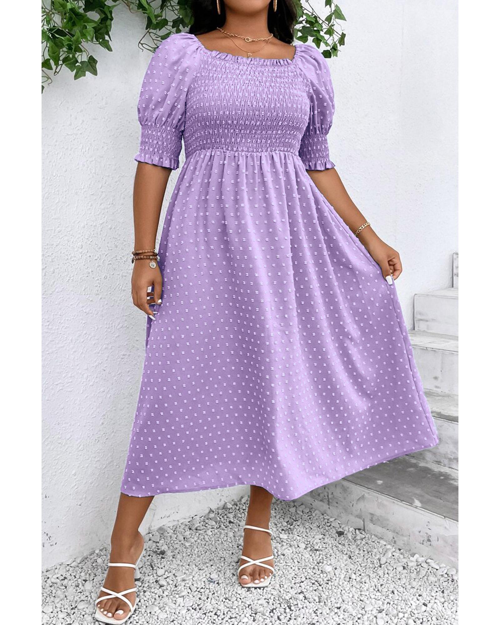 Wisteria Swiss Dot Smocked Frilled Neckline Short Sleeve Plus Size Dress – 1X
