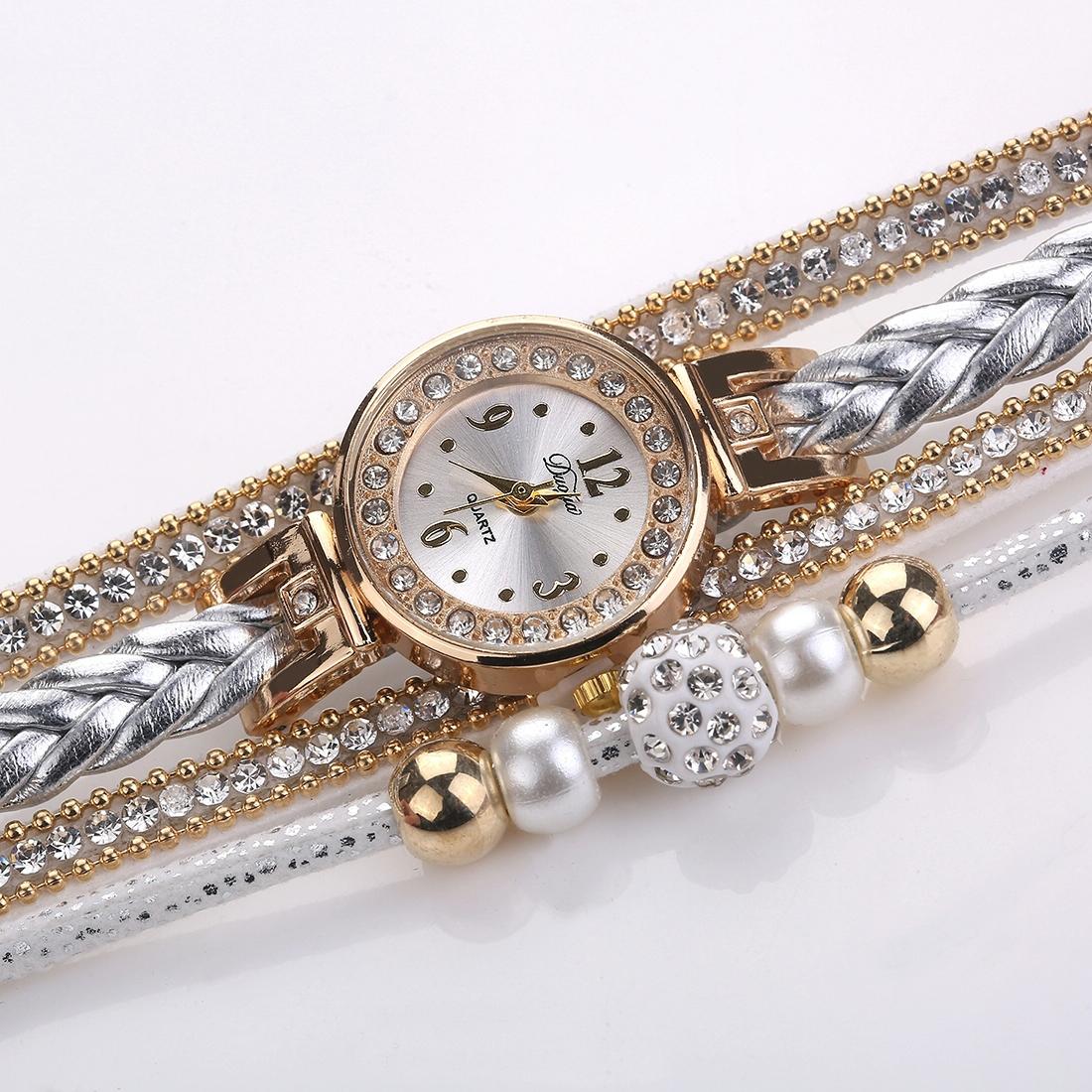 Women Beige Woven Pearl Bracelet Watch – Round Analog Quartz – White