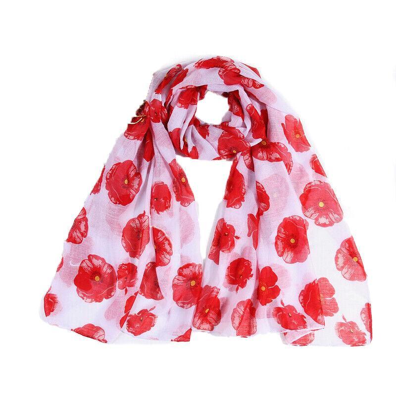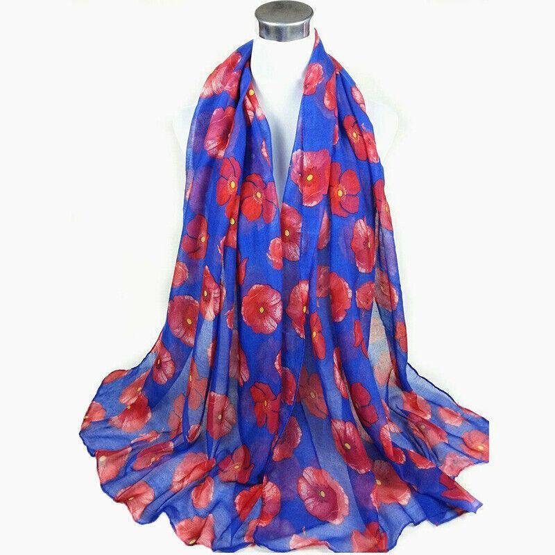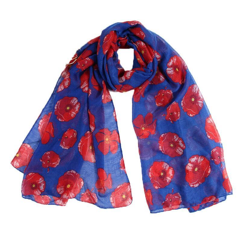 Women Ladies Poppy Print Floral Scarf Remembrance Day Poppies Scarves Wrap Shawl – Royal Blue