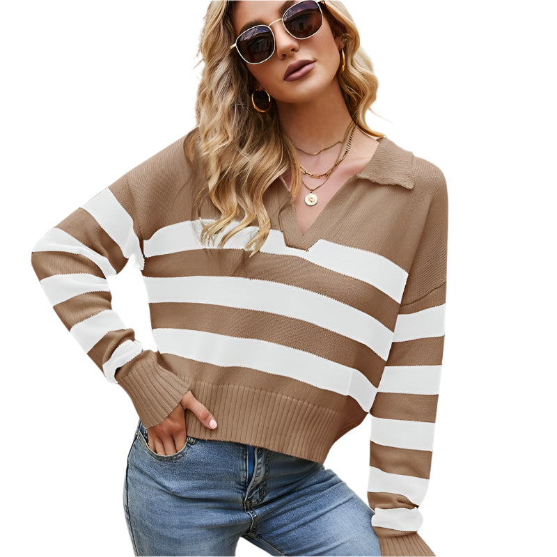 Women Lapel Cotton Knit Top Loose Stripes Hit Colour Pullover Sweater – Brown -White – M