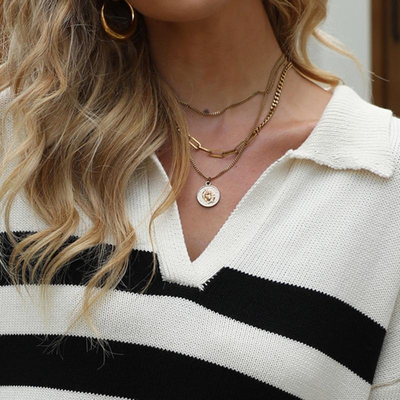 • 1 x Women Lapel Cotton Knit Top Loose Stripes Hit Colour Pullover Sweater