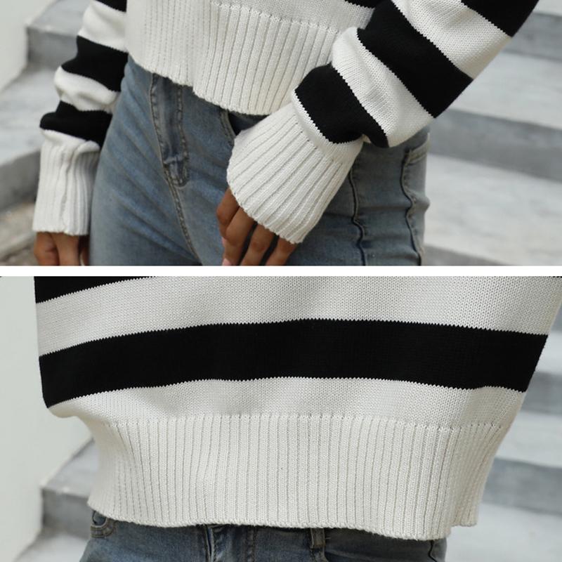 Women Lapel Cotton Knit Top Loose Stripes Hit Colour Pullover Sweater - Brown -White - Xs Original price was: $102.99.Current price is: $55.99.