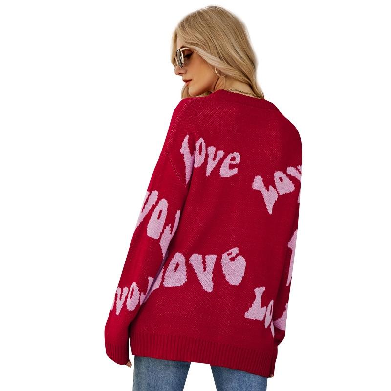 Women Round Neck Knitted Sweater Letters Jacquard Pullover Sweater – Size M – Red