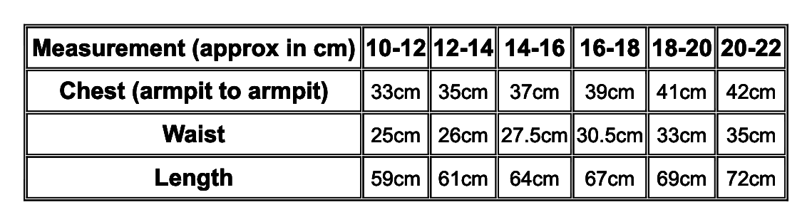 | Chest (armpit to armpit) | 33cm | 35cm | 37cm | 39cm | 41cm | 42cm |