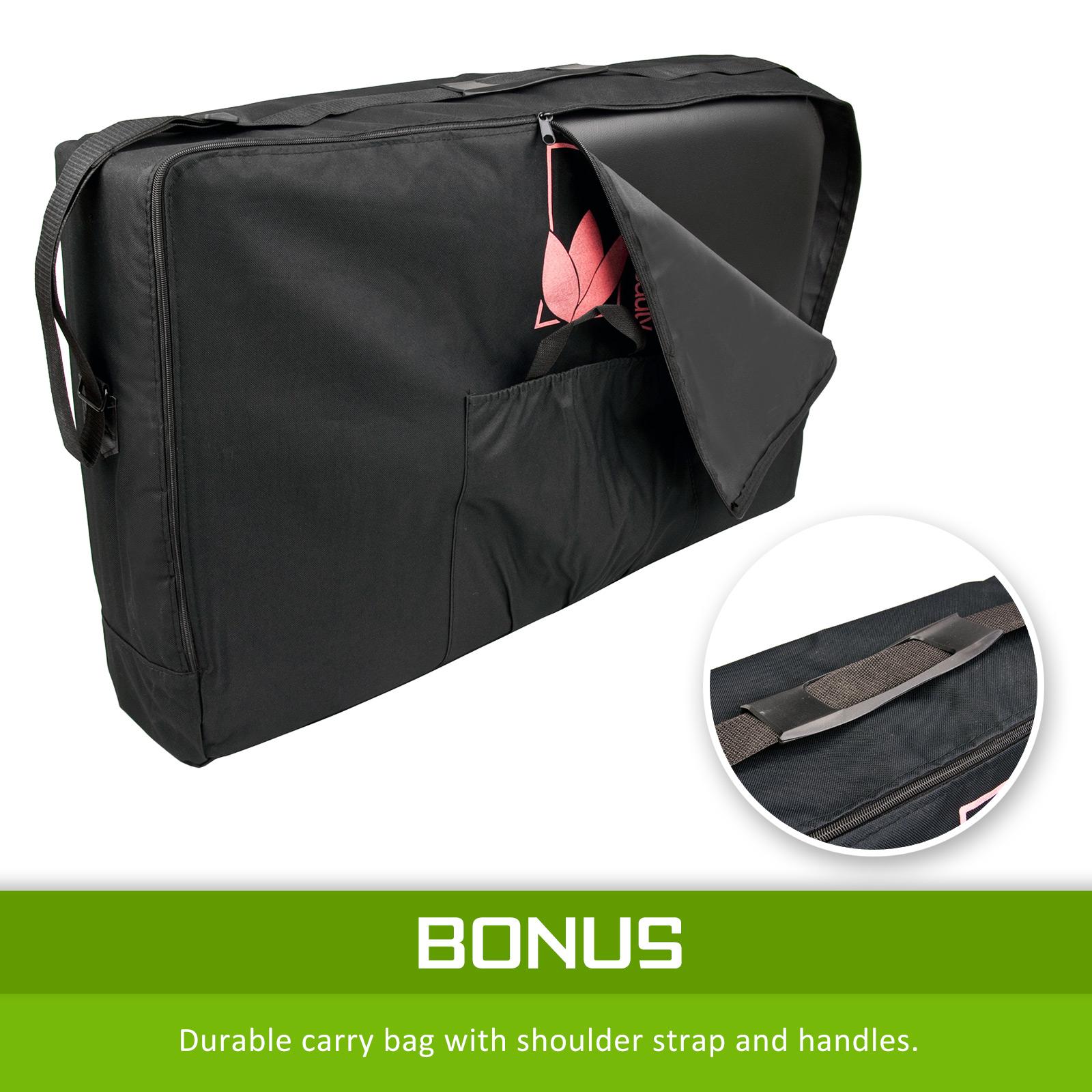 The upholstery is comprised of three-inch thick high density small-cell foam padding and oil water-proof polyurethane vinyl. The heavy duty aluminium frame is strong and light weight, so if you need to transport it for work or simply need to rearrange your work environment it can be done very easily. In addition, it can be very compact when folded so it is easy to store and keep your storage tidy. It comes with a carry bag to add to your convenience and also to keep it clean when not in use. This massage table is ideal for students, new practitioners, and home users with limited budgets.