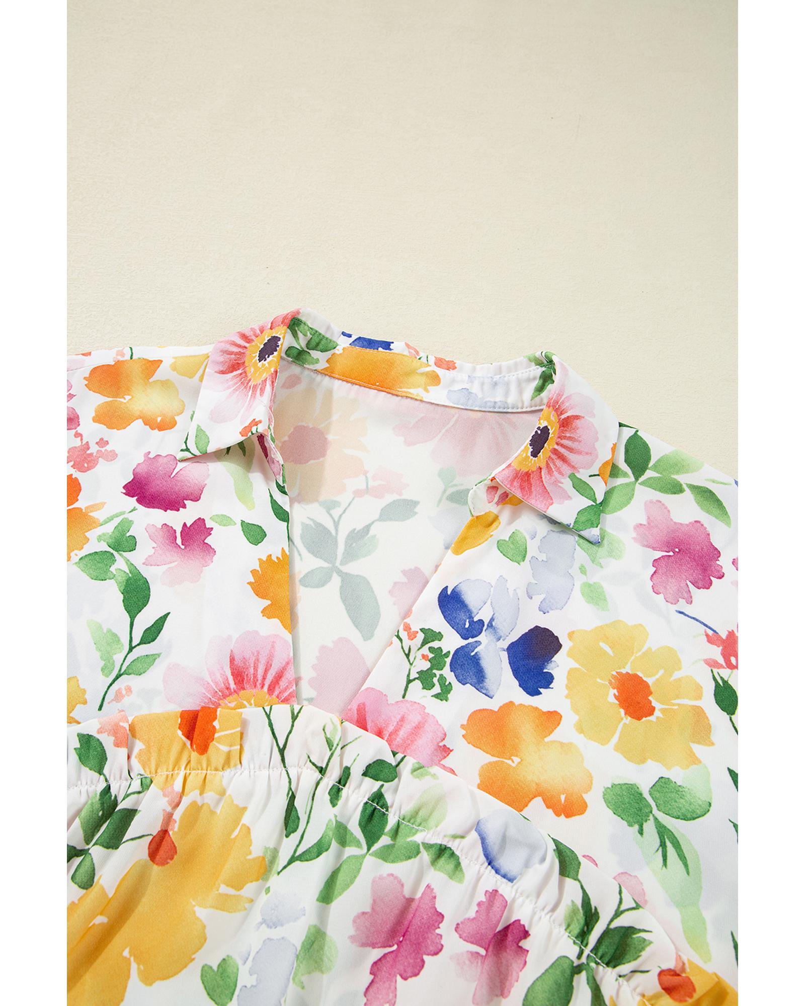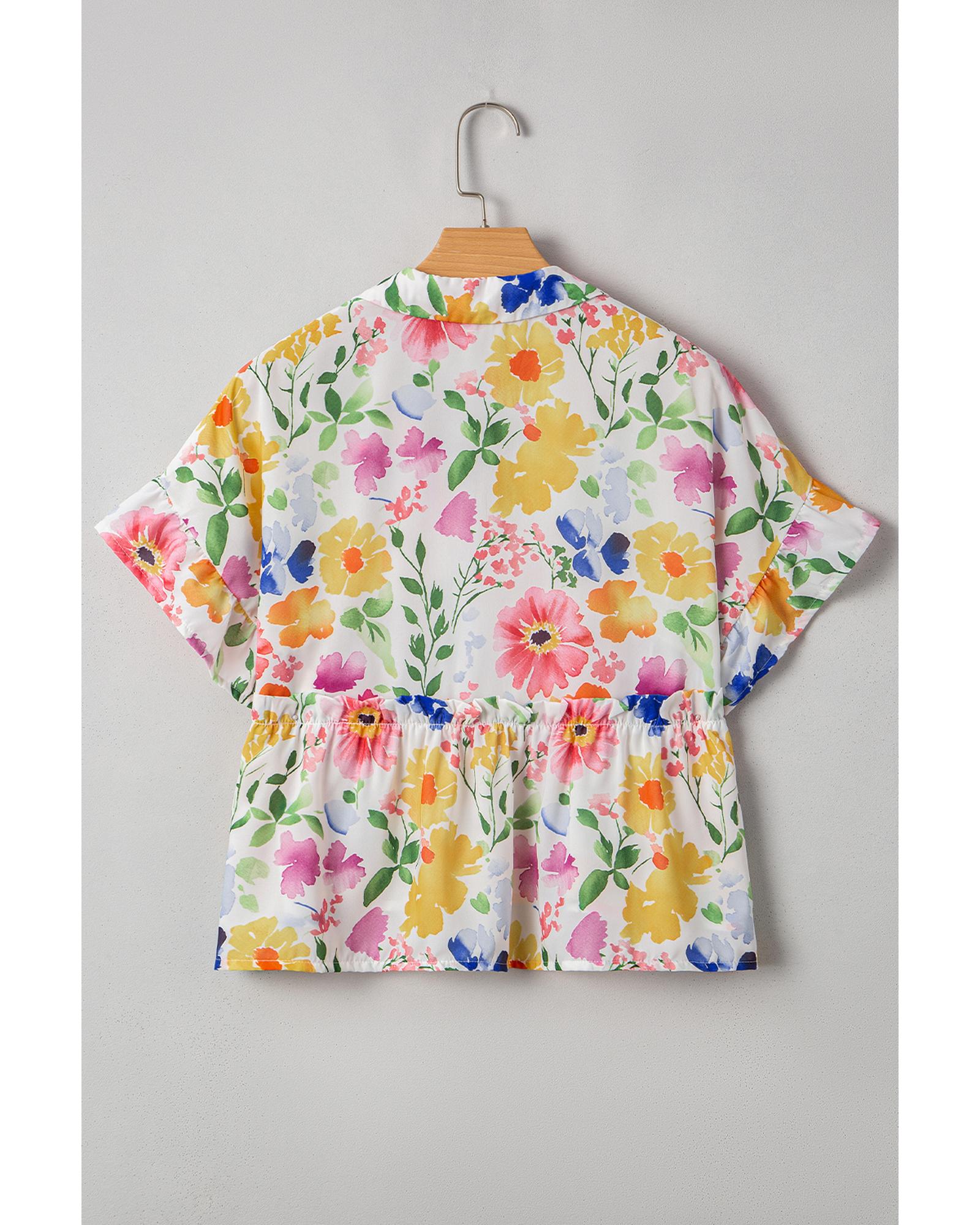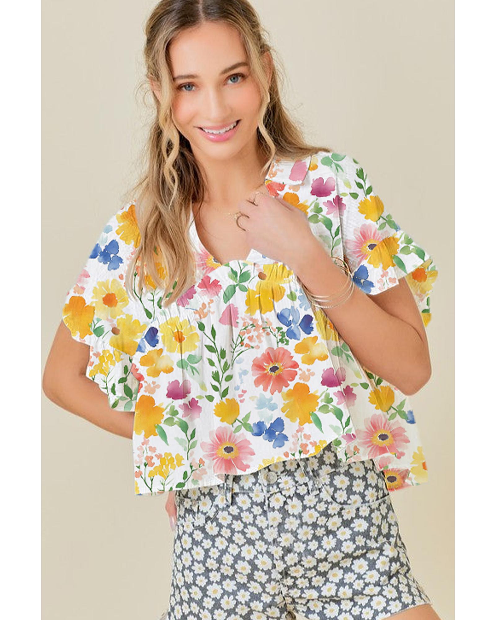 Yellow Floral Boxy Fit Ruffled Short Sleeve V Neck Blouse – S