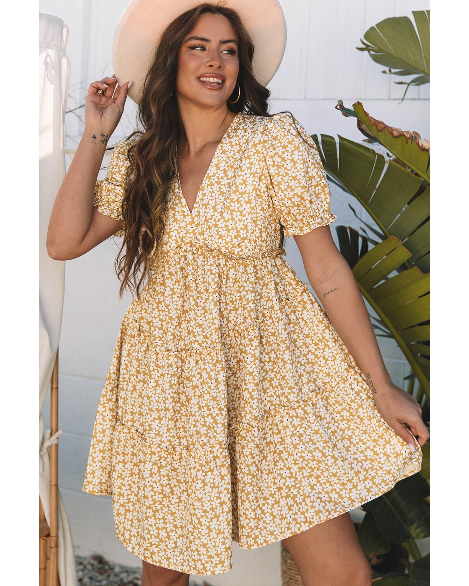 Yellow Floral Short Sleeve V Neck Frilly Tiered Mini Dress – XL