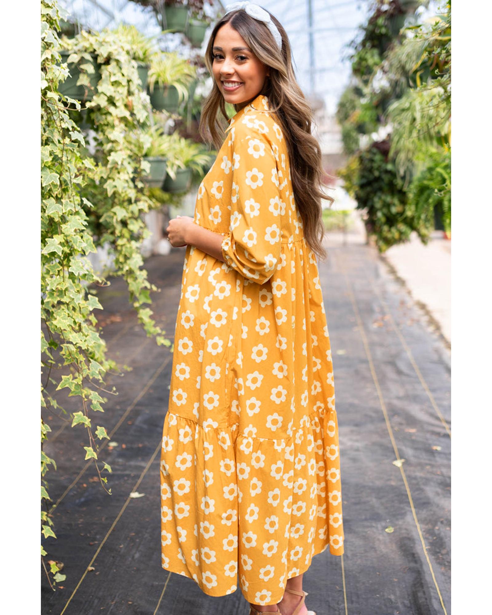 Yellow Flower Print Bracelet Sleeve Buttons Collared Maxi Dress – XL