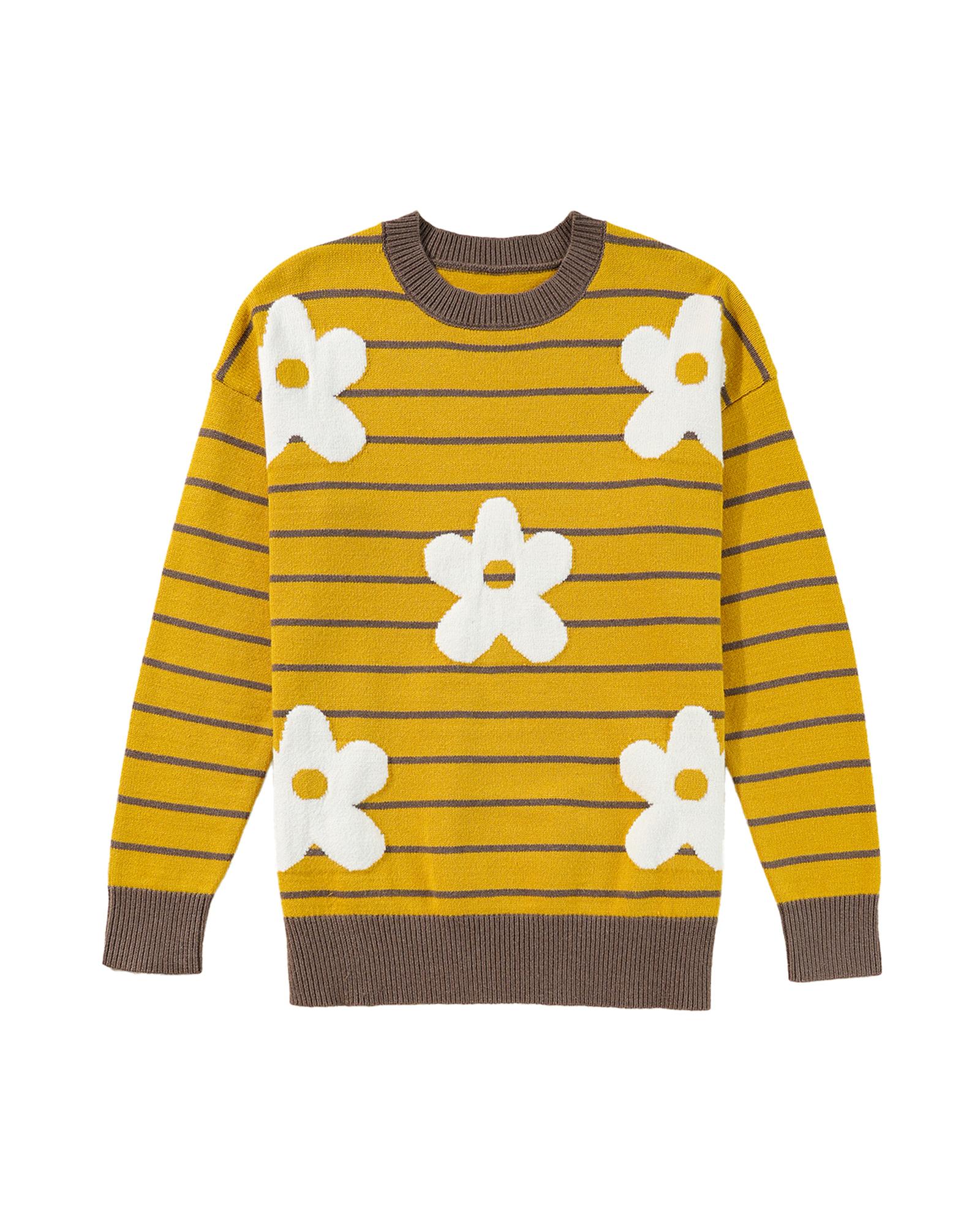 - Yellow Stripe Daisy Floral Knitted Round Neck Sweater