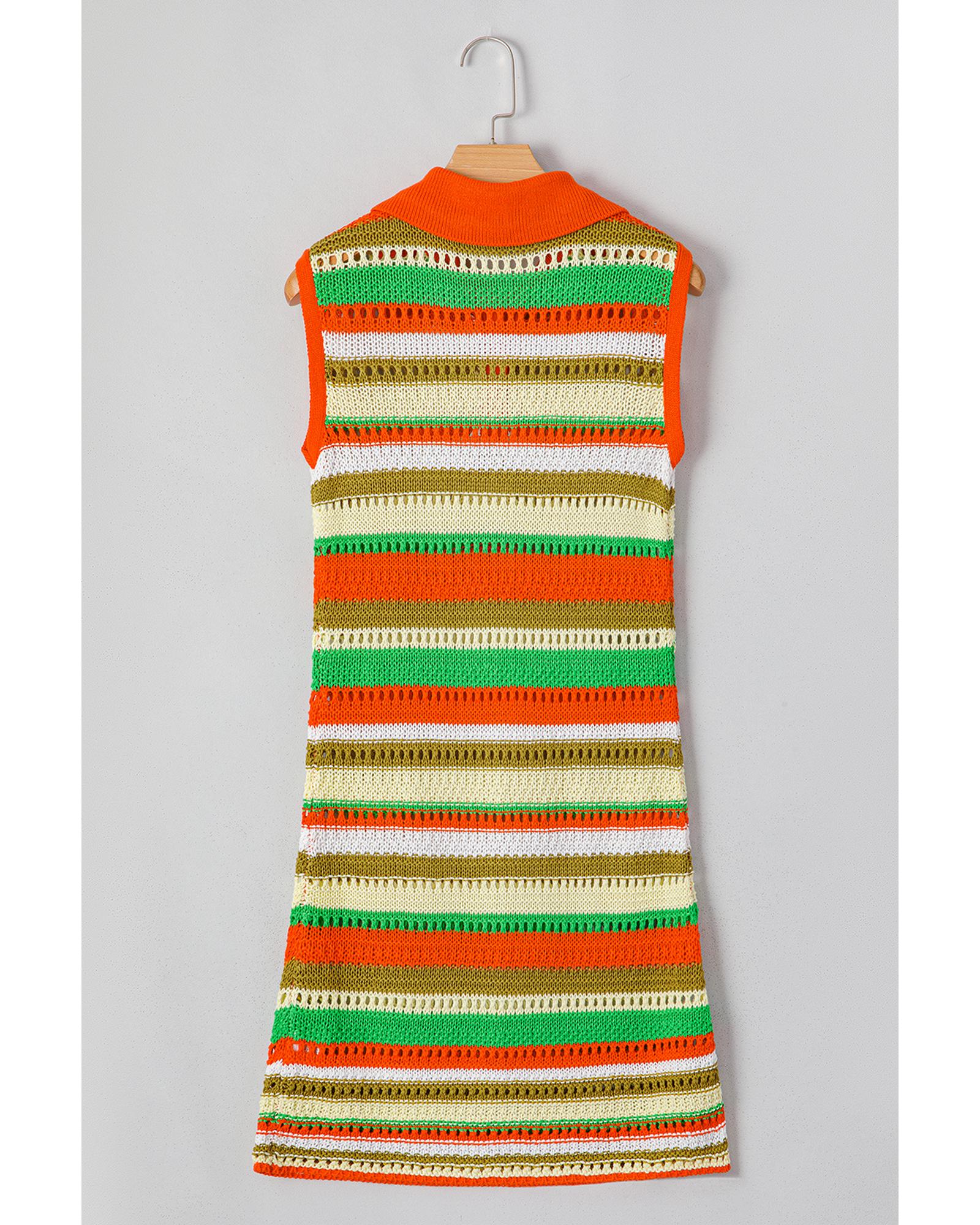 Yellow Stripe Eyelet Sleeveless Buttoned Split Neck Sweater Dress – XL