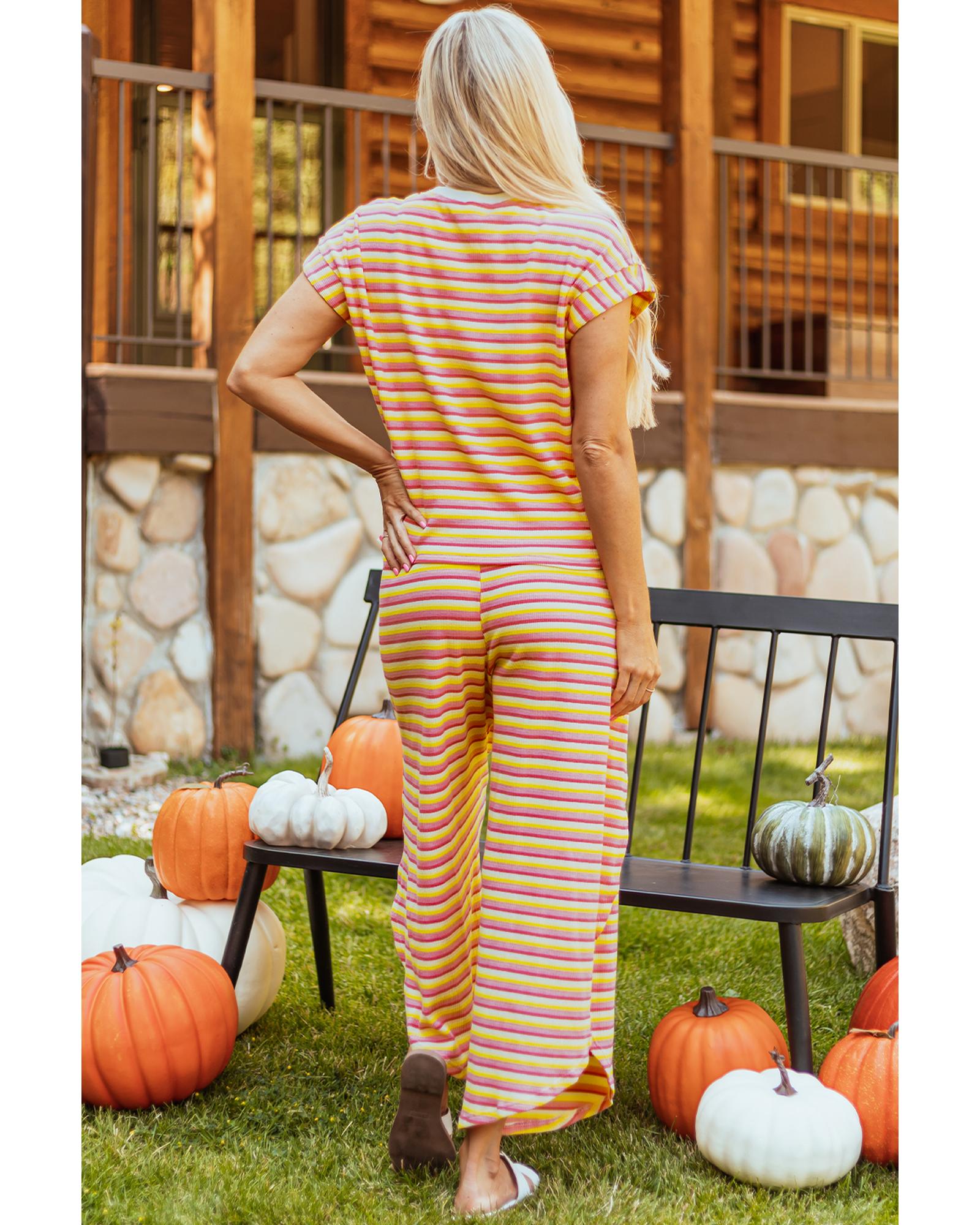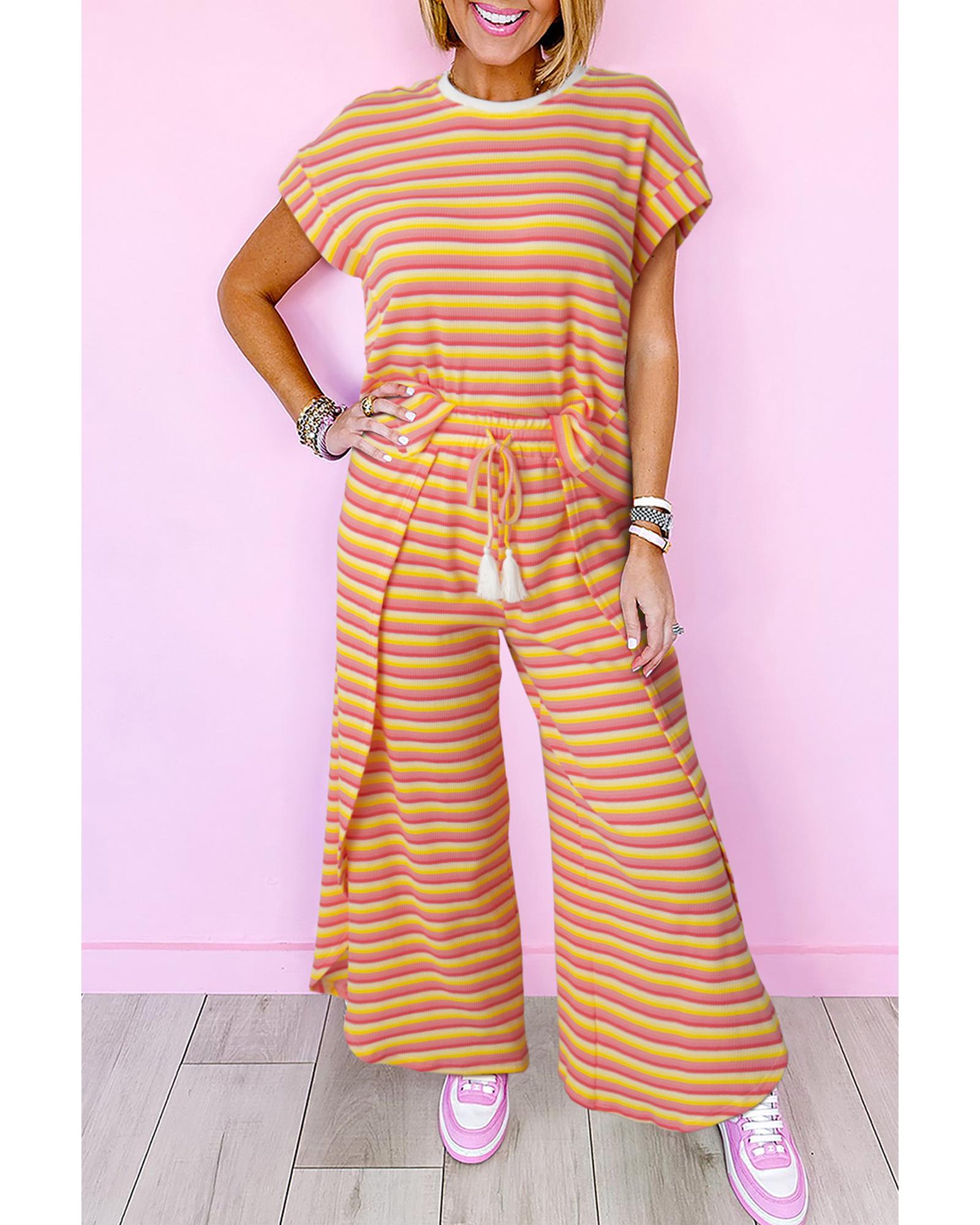 Yellow Stripe Rainbow Tee Tasseled String Wide Leg Pants Set – XL