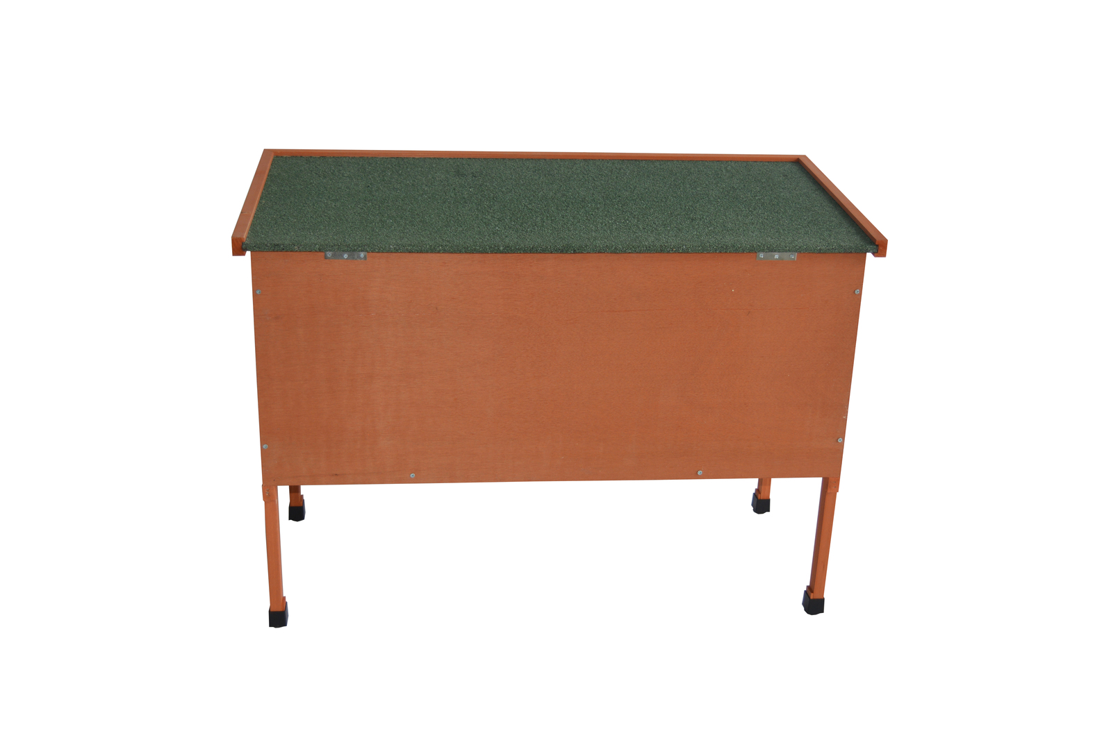 Single storey guinea pig/rabbithutchon legs, off the ground design. large access door with a lift up asphalt roof for maximum rain and heat protection.