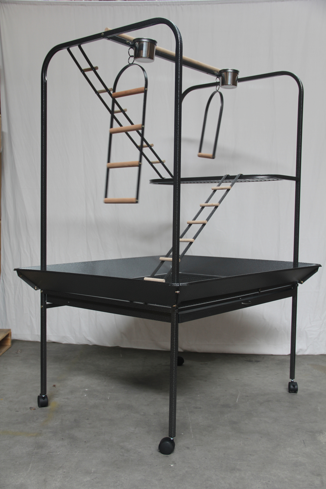 - Big metal swing ladder, multiple wooden perches for resting plus 2 stainless steel bowls for food and water